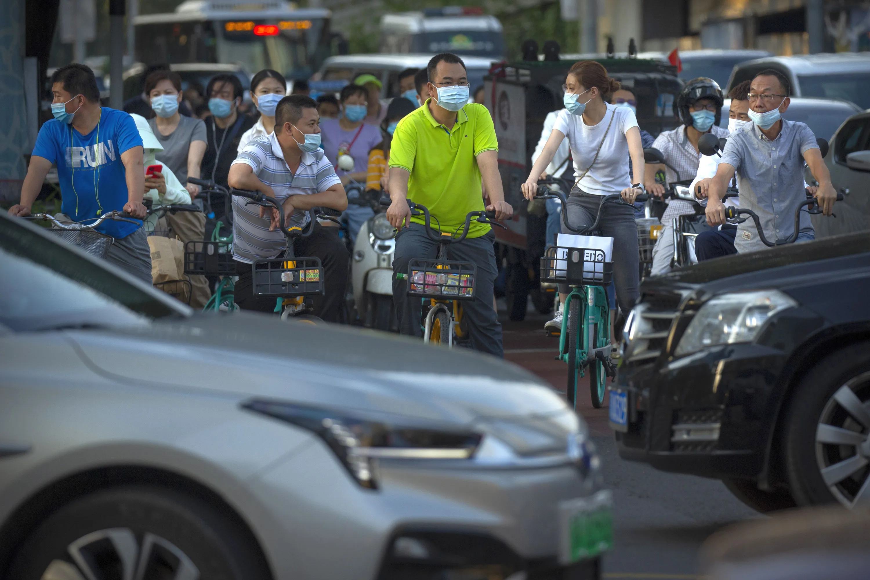 People wearing face masks to protect against the coronavirus wait to cross an intersection in the central business district in Beijing, Friday, August 21, 2020. Authorities in China's capital announced on Thursday that masks would no longer be mandatory outdoors as a virus outbreak in the country's northwestern region of Xinjiang appears to have been brought under control. (Photo by Mark Schiefelbein/AP Photo)