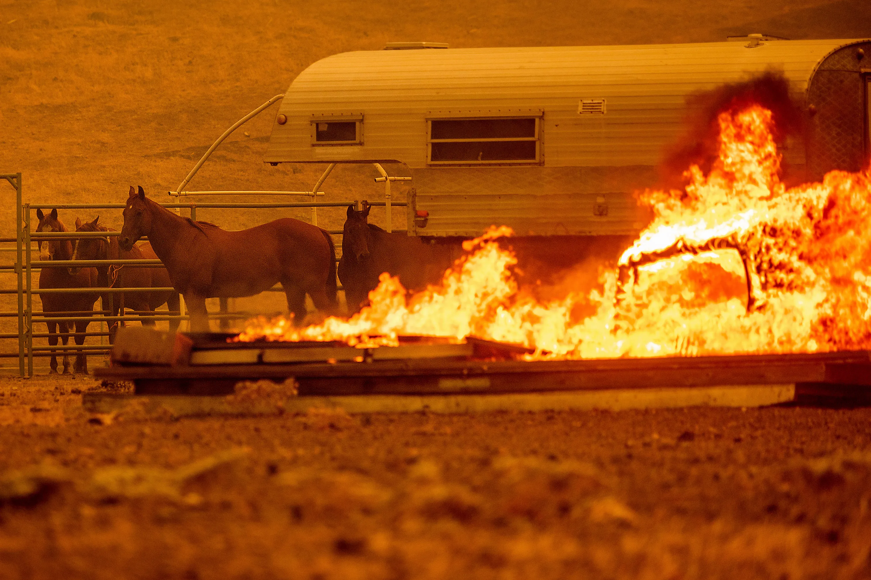 Horses stand in an enclosure as the LNU Lightning Complex fires tear through the Spanish Flats community in unincorporated Napa County, Calif., Tuesday, August 18, 2020. Fire crews across the region scrambled to contain dozens of wildfires sparked by lightning strikes as a statewide heat wave continues. (Photo by Noah Berger/AP Photo)