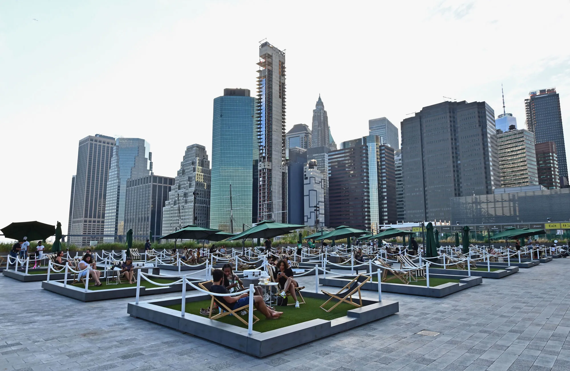 People relax on socially distant mini lawns at the rooftop of Pier 17, called “The Greens”, on August 14, 2020 in the Seaport District of New York City. The rooftop had to cancel its entire run of concerts and special events this season due to the COVID-19 pandemic. (Photo by Angela Weiss/AFP Photo)