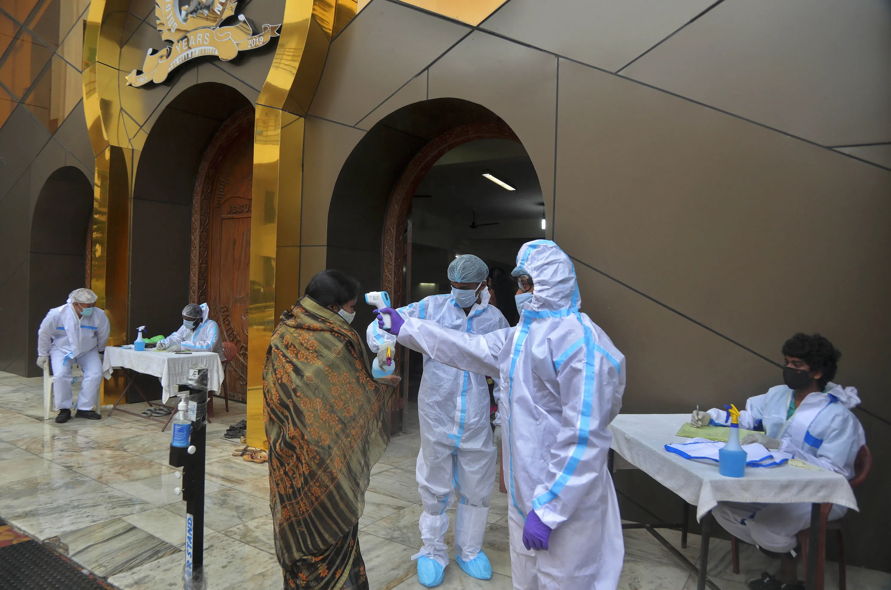 Baptist Church members wearing personal protective suits check the body temperature of devotees arriving to attend a Sunday service in Hyderabad, India, Sunday, August 16, 2020. India is the third hardest-hit country by the pandemic in the world after the United States and Brazil. (Photo by Mahesh Kumar A./AP Photo)