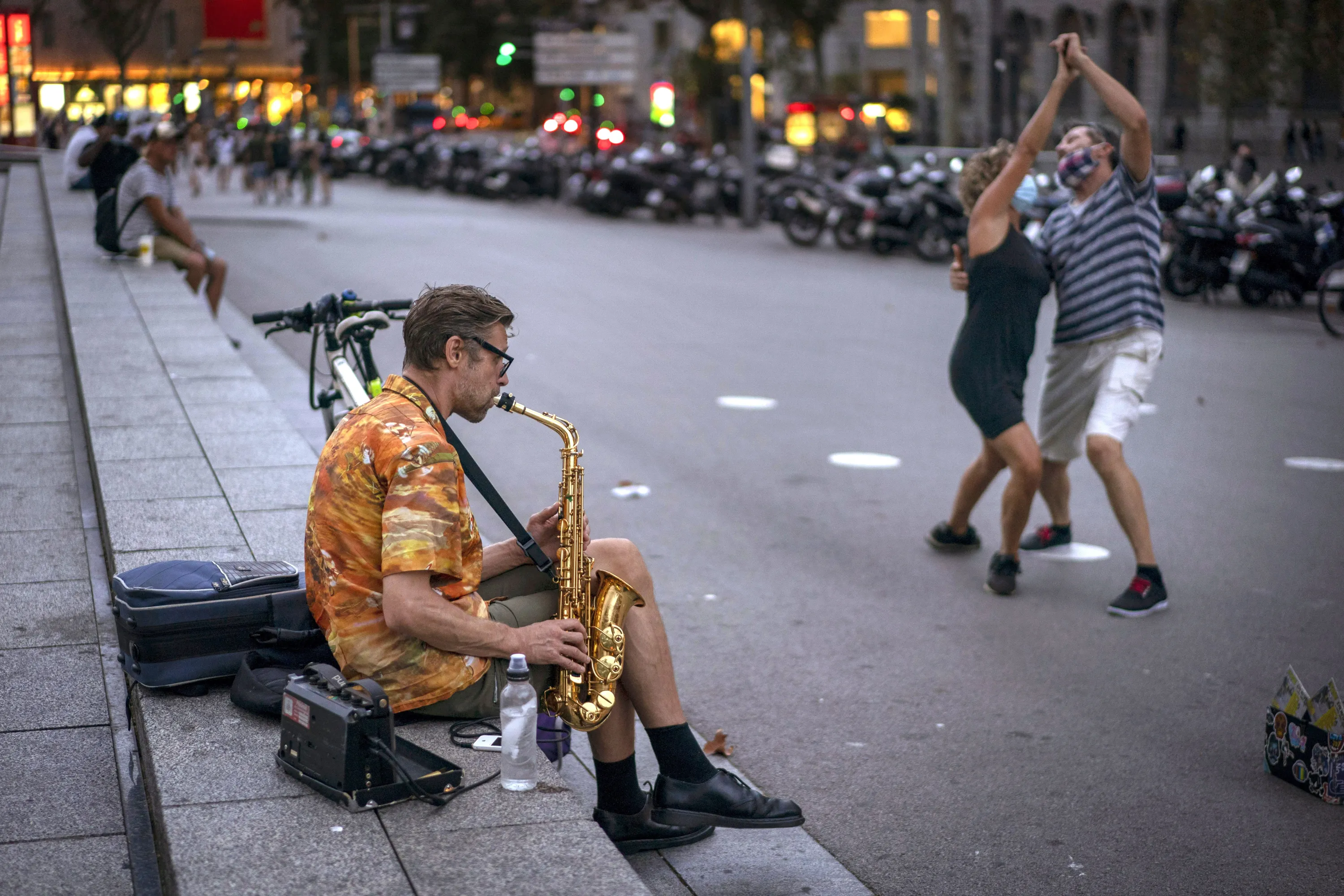 A man plays his saxophone as a couple wearing face masks dance in the street in Barcelona, Spain on Friday, August 28, 2020. Spanish authorities have announced new restrictions to prevent COVID-19. (Photo by Emilio Morenatti/AP Photo)