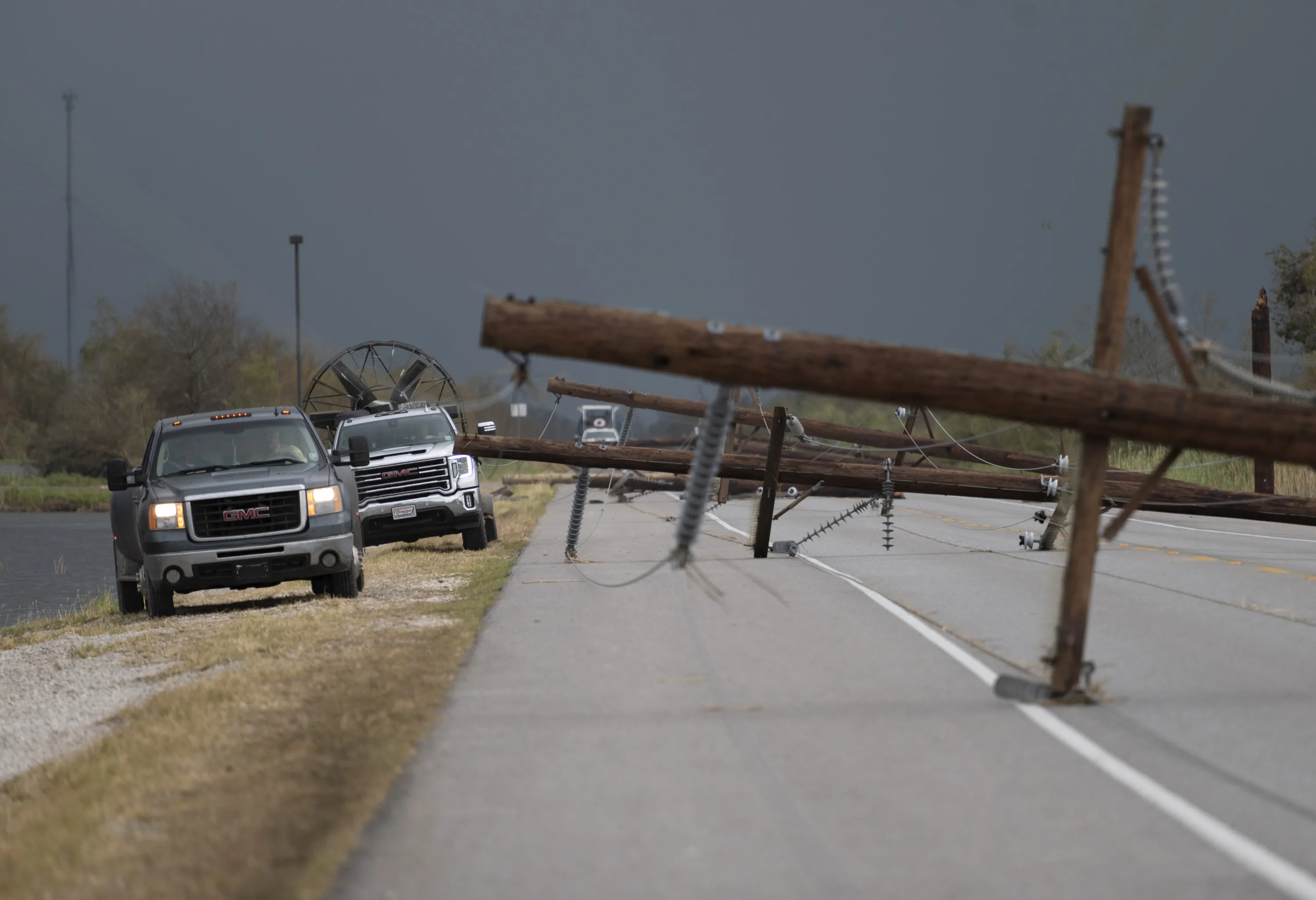People trying to reach their homes in Cameron parish drive past downed power lines after the passing of Hurricane Laura south of Lake Charles, Louisiana on August 28, 2020. At least six people were killed by Hurricane Laura in Louisiana and search teams may find more victims, but the governor said on August 27 that the most powerful storm to make landfall in the US state in living memory did not cause the “catastrophic” damage that had been feared. (Photo by Andrew Caballero-Reynolds/AFP Photo)