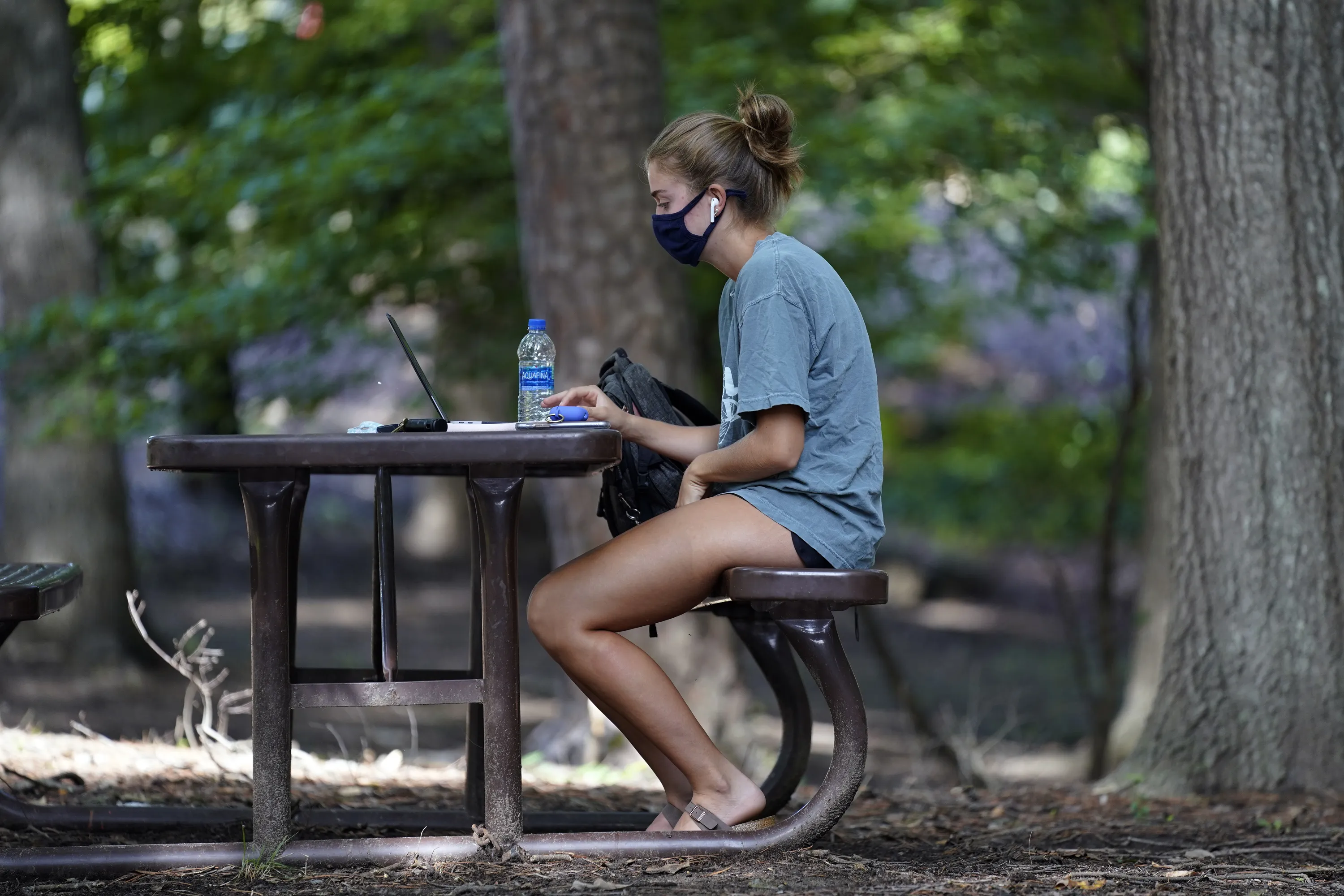In this August 18, 2020, file photo, a student works outside Ehrighaus dormitory on campus at the University of North Carolina in Chapel Hill, N.C. As more and more schools and businesses around the country get the OK to reopen, some college towns are moving in the opposite direction because of too much partying and too many COVID-19 infections among students. (Photo by Gerry Broome/AP Photo/File)