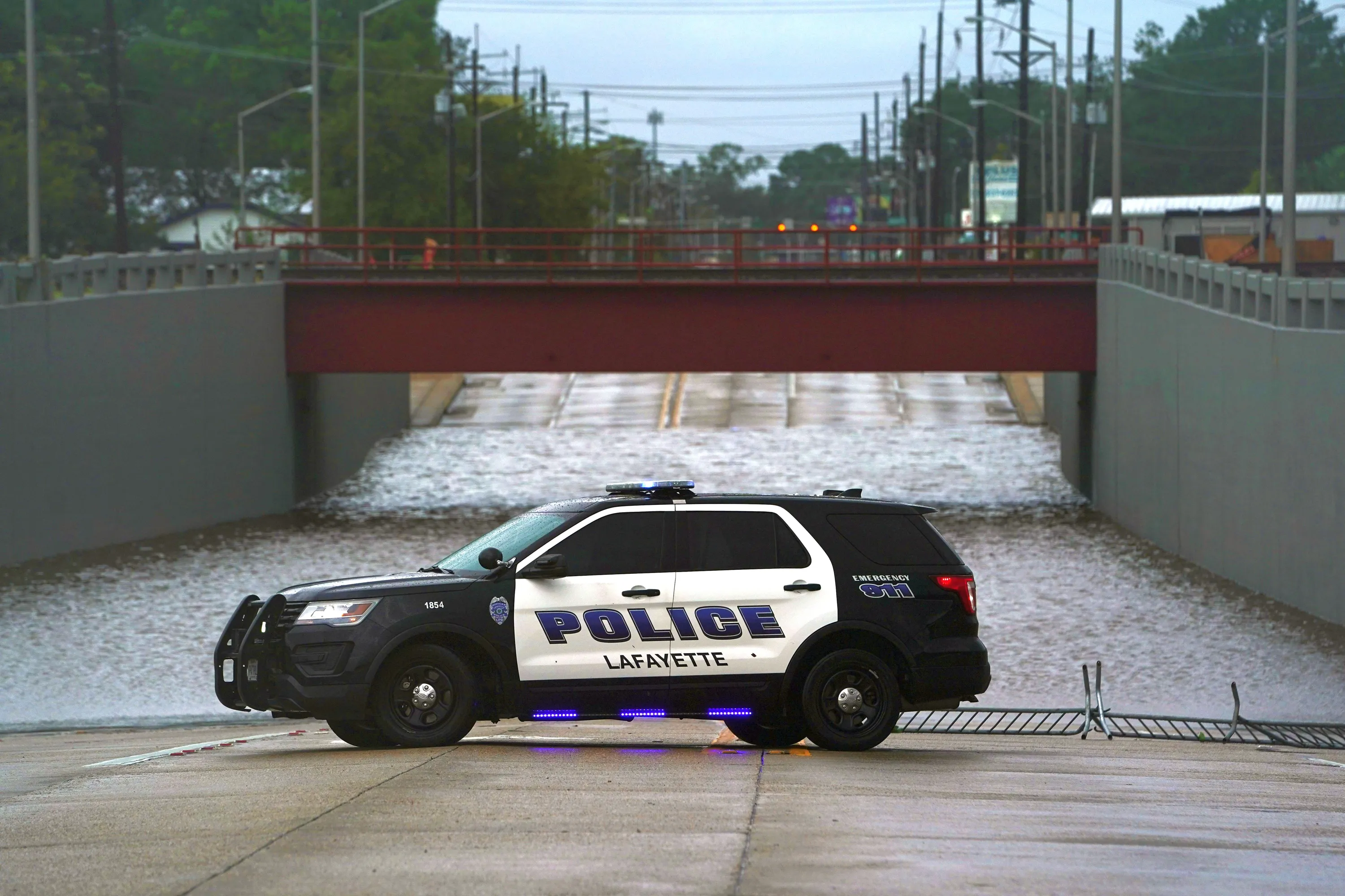 A police car is seen next to a flooded underpass after Hurricane Laura passed through Lafayette, Louisiana, U.S. on August 27, 2020. (Photo by Elijah Nouvelage/Reuters)