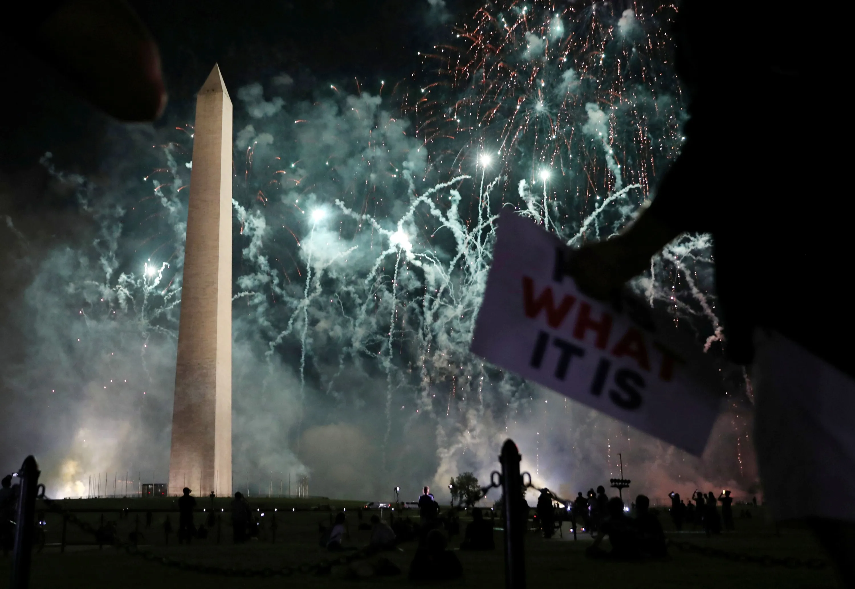 Protesters watch from Constitution Avenue as Trump campaign fireworks explode behind the Washington Monument in Washington, U.S. August 27, 2020. (Photo by Leah Millis/Reuters)