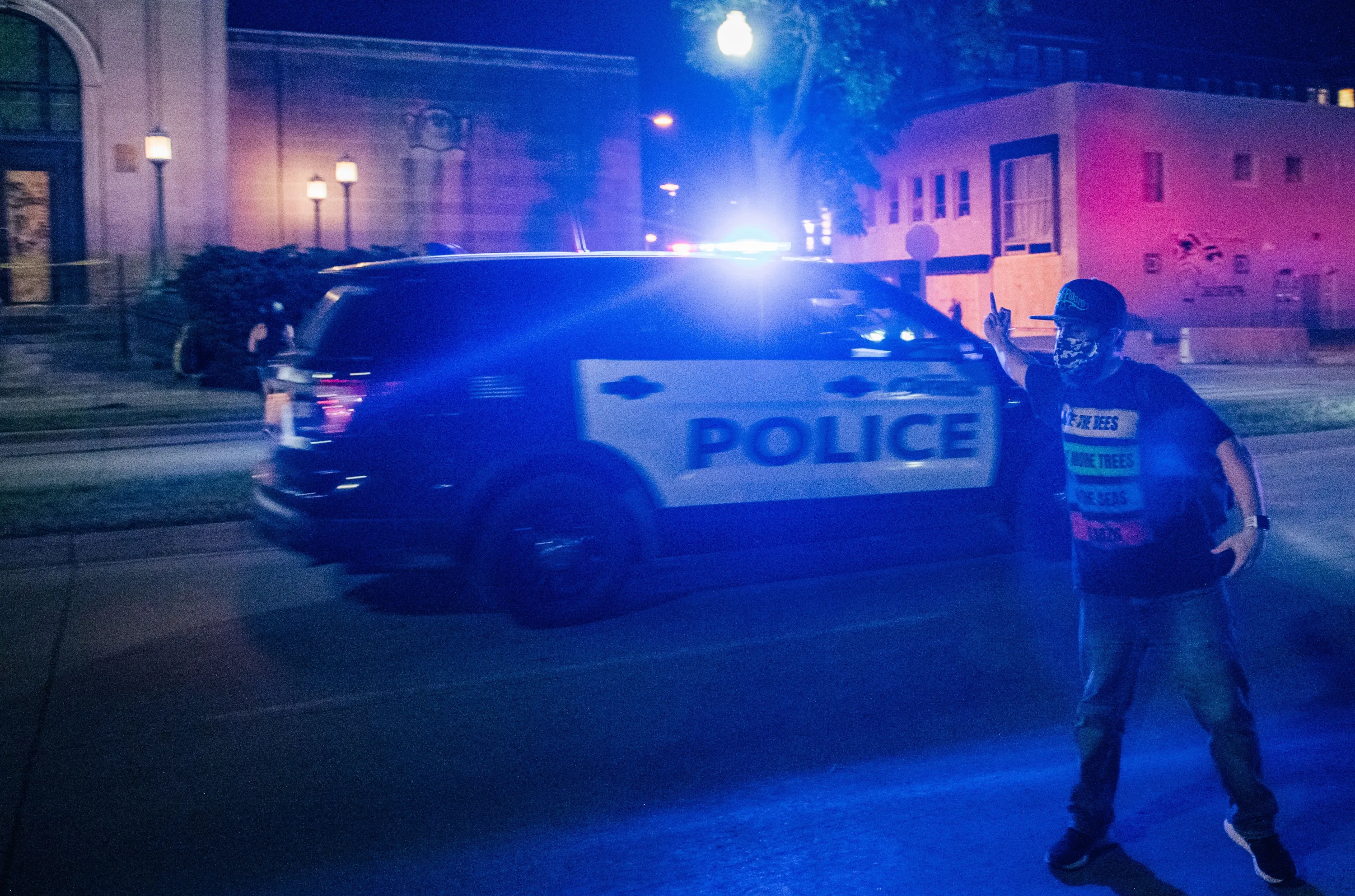 A demonstrator antagonizes a passing police vehicle on August 26, 2020 in Kenosha, Wisconsin. As the city declared a state of emergency curfew, a fourth night of civil unrest occurred after the shooting of Jacob Blake, 29, on August 23. Video shot of the incident appears to show Blake shot multiple times in the back by Wisconsin police officers while attempting to enter the drivers side of a vehicle. The 29-year-old Blake was undergoing surgery for a severed spinal cord, shattered vertebrae and severe damage to organs, according to the family attorneys in published accounts. (Photo by Brandon Bell/Getty Images)
