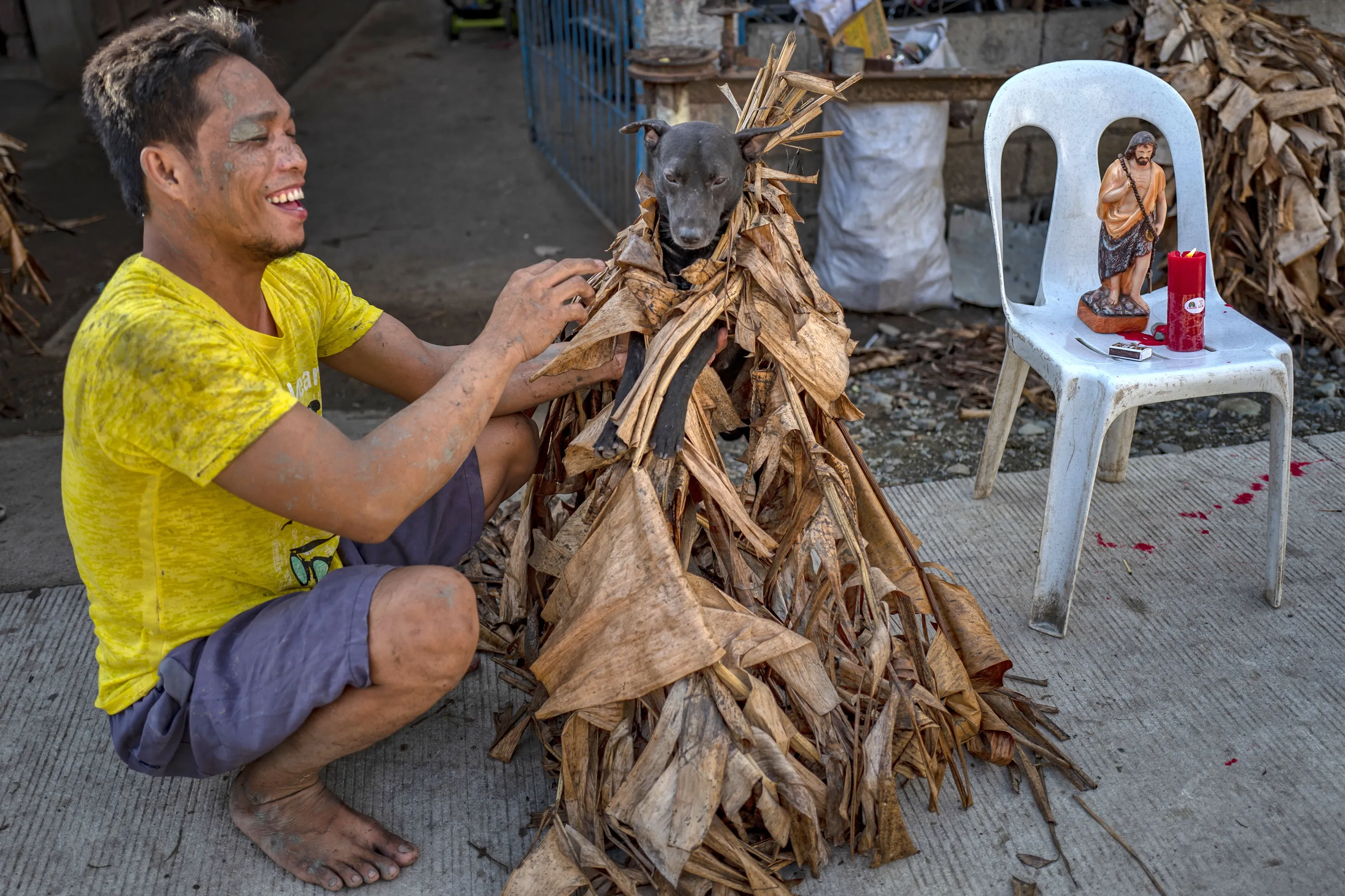 A devotee covers a dog in mud and dried banana leaves to celebrate the Taong Putik (“mud people”) Festival on June 24, 2020 in the village of Bibiclat in Aliaga town, Nueva Ecija province, Philippines. Each year, the residents of Bibiclat village in Aliaga town celebrate the Feast of Saint John by covering themselves in mud, dried banana leaves, vines, and twigs as part of a little-known Catholic festival which traces its history from the Pacific War and reenacts how rain stopped the execution of 14 villagers by Japanese soldiers in 1944. The townsfolk considered this as a miracle from Saint John, and every year since then the villagers roll in mud to show their gratitude to the saint. Due to the coronavirus pandemic, religious gatherings remain banned as part of government lockdown measures, and devotees have been advised to celebrate in their homes. With more than 30,000 cases and more than a thousand deaths, the Philippines is one of the worst coronavirus-hit countries in Southeast Asia, despite imposing the longest lockdown in the world surpassing 100 days. (Photo by Ezra Acayan/Getty Images)