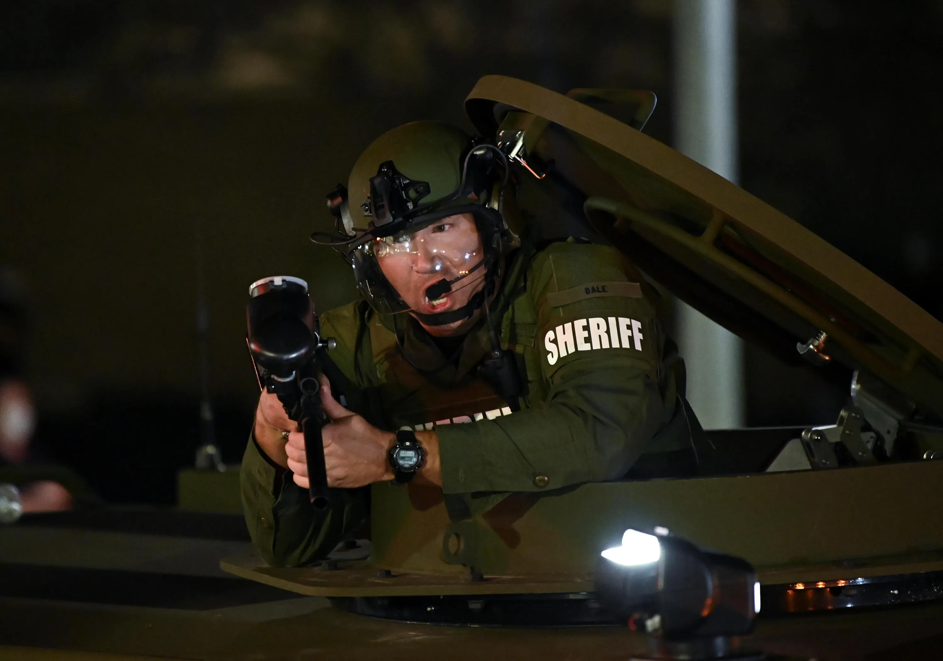 A law enforcement officer holds a weapon as he stands in the hatch of an armored vehicle as people protest outside the Kenosha County Courthouse after a Black man, identified as Jacob Blake, was shot several times by police in Kenosha, Wisconsin, U.S. August 25, 2020. (Photo by Stephen Maturen/Reuters)