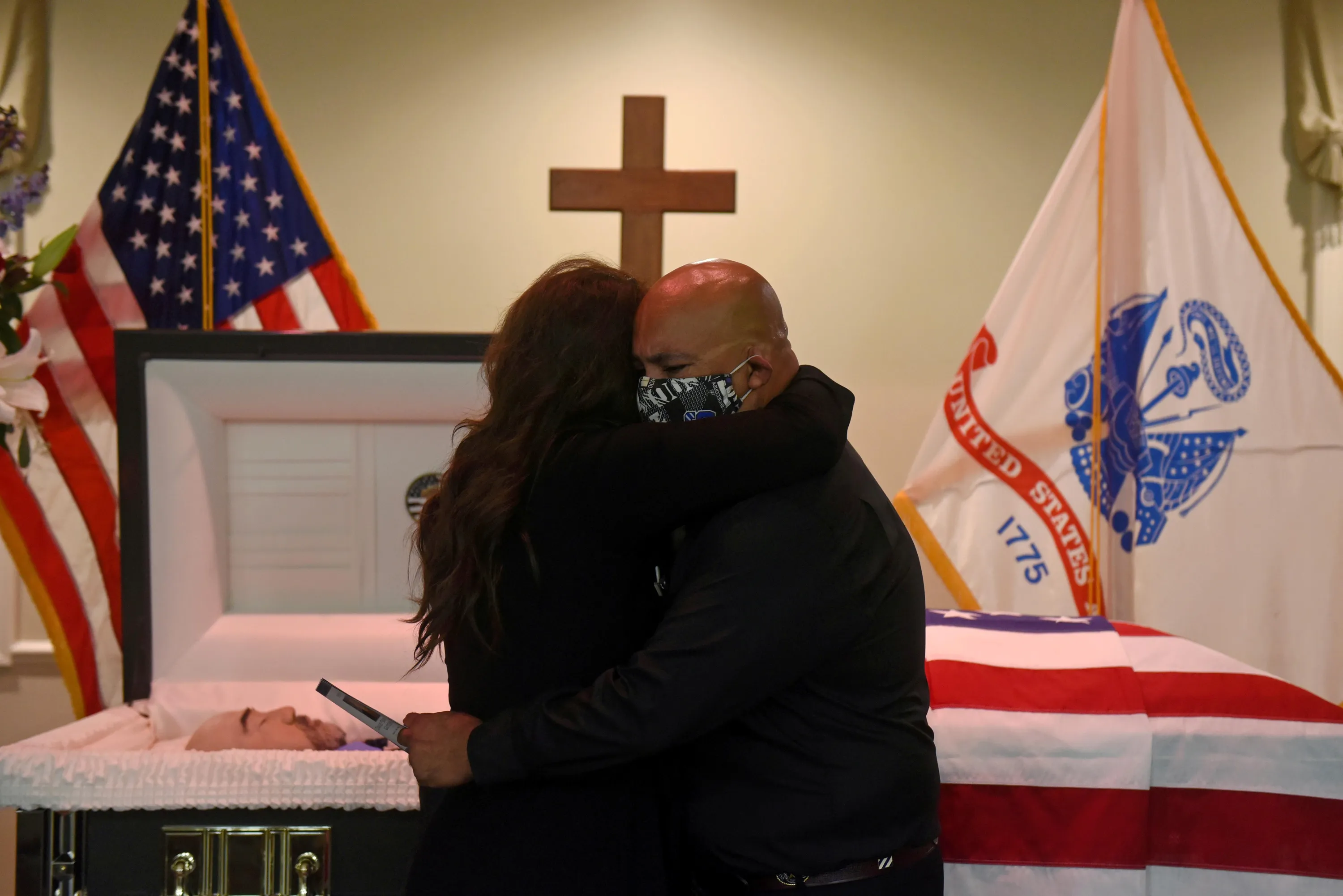 Walter Campos and Lyn Wolf hug as family and friends attend a funeral for David Gutierrez in Houston, Texas, August 26, 2020. Gutierrez died of COVID-19 after more than a month in a Houston hospital. His wife Michelle and her daughters gathered under his hospital window to pray for him. Before he was put on a ventilator, the couple managed to text one another, she said. But once he was in a coma, she began faxing letters to the hospital, and nurses would read them aloud to him. (Photo by Callaghan O'Hare/Reuters)