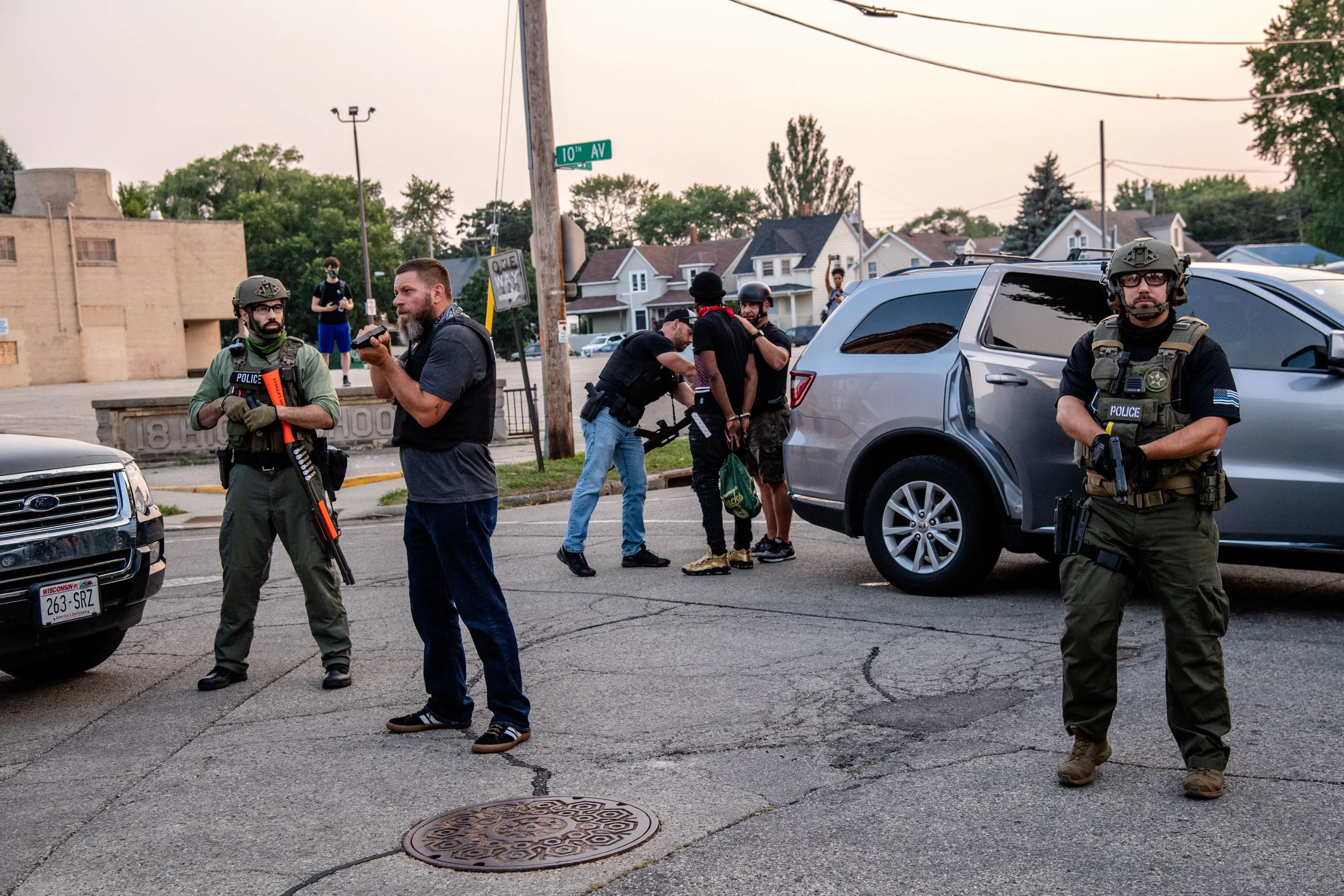 A protester is detained by federal agents and police officers as protesters gather outside of Kenosha County Court House on August 26, 2020 in Kenosha, WI. Protesters have gathered for the fourth day following the shooting of Jacob Blake, 29, on August 23. Video of the incident appears to show Blake shot multiple times in the back by Wisconsin police officers while attempting to enter the drivers side of a vehicle. (Photo by Amy Harris/Rex Features/Shutterstock)