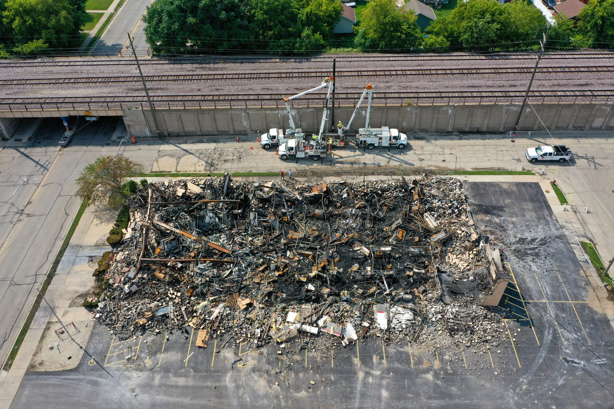 A view of a damaged area after a group of protestors who lit dealership last night over the shooting of a black man Jacob Blake by police officer in Kenosha, Wisconsin, United States on August 25, 2020. The Wisconsin National Guard has been deployed to Kenosha after the man was shot several times at close range in the back during an encounter with a police officer, which was caught on video. (Photo by Tayfun Coskun/Anadolu Agency via Getty Images)