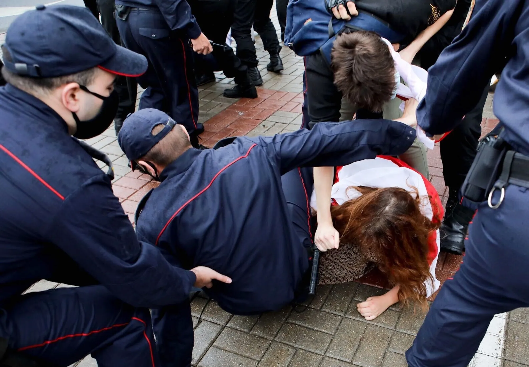 Police detain students during a protest against presidential election results in Minsk, Belarus, Tuesday, September 1, 2020. (Photo by Tut.By via AP Photo)