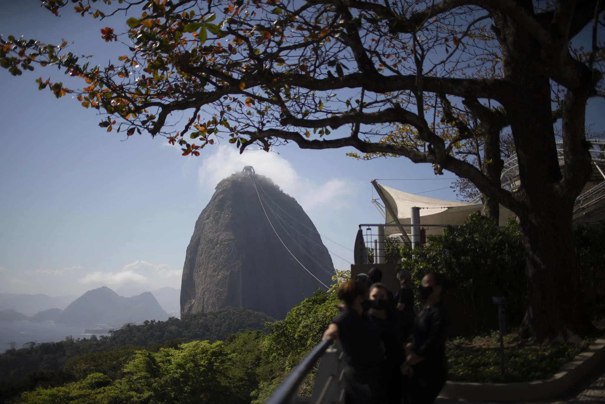 Workers take a break with Sugar Loaf mountain in the background, amid the new coronavirus pandemic in Rio de Janeiro, Brazil, Wednesday, August 12, 2020. Rio de Janeiro's iconic tourist attractions, the Aquarium, Sugarloaf Mountain, the Christ the Redeemer statue, and the “Rio Star” Ferris wheel will re-open to tourism next Saturday, as the city eases its lockdown. (Photo by Silvia Izquierdo/AP Photo)