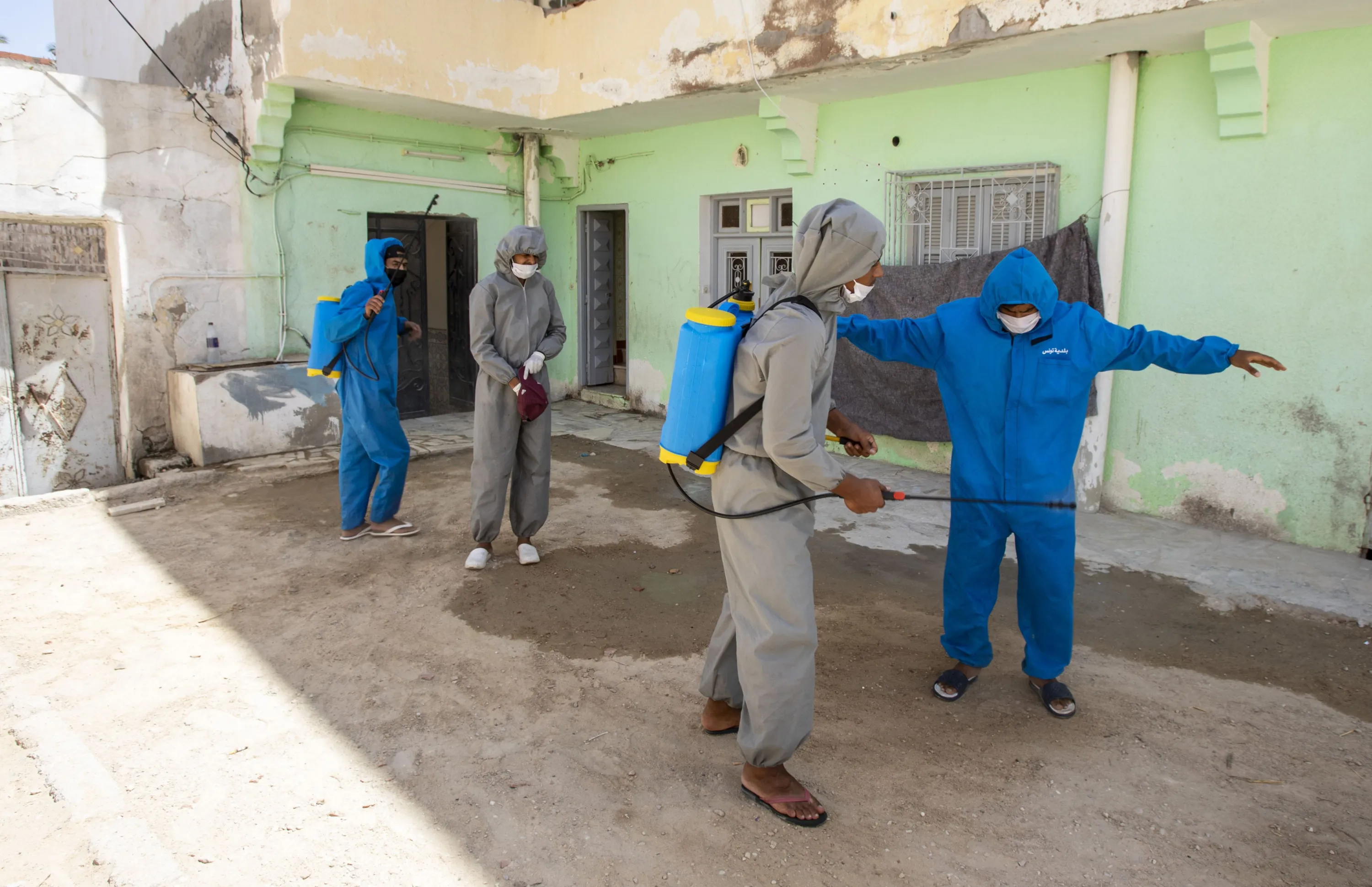 Health care workers disinfect the novel coronavirus (COVID-19) patients' houses as a precaution while the number of cases increase in southern district Gabes, Tunisia on August 23, 2020. (Photo by Nacer Talel/Anadolu Agency via Getty Images)