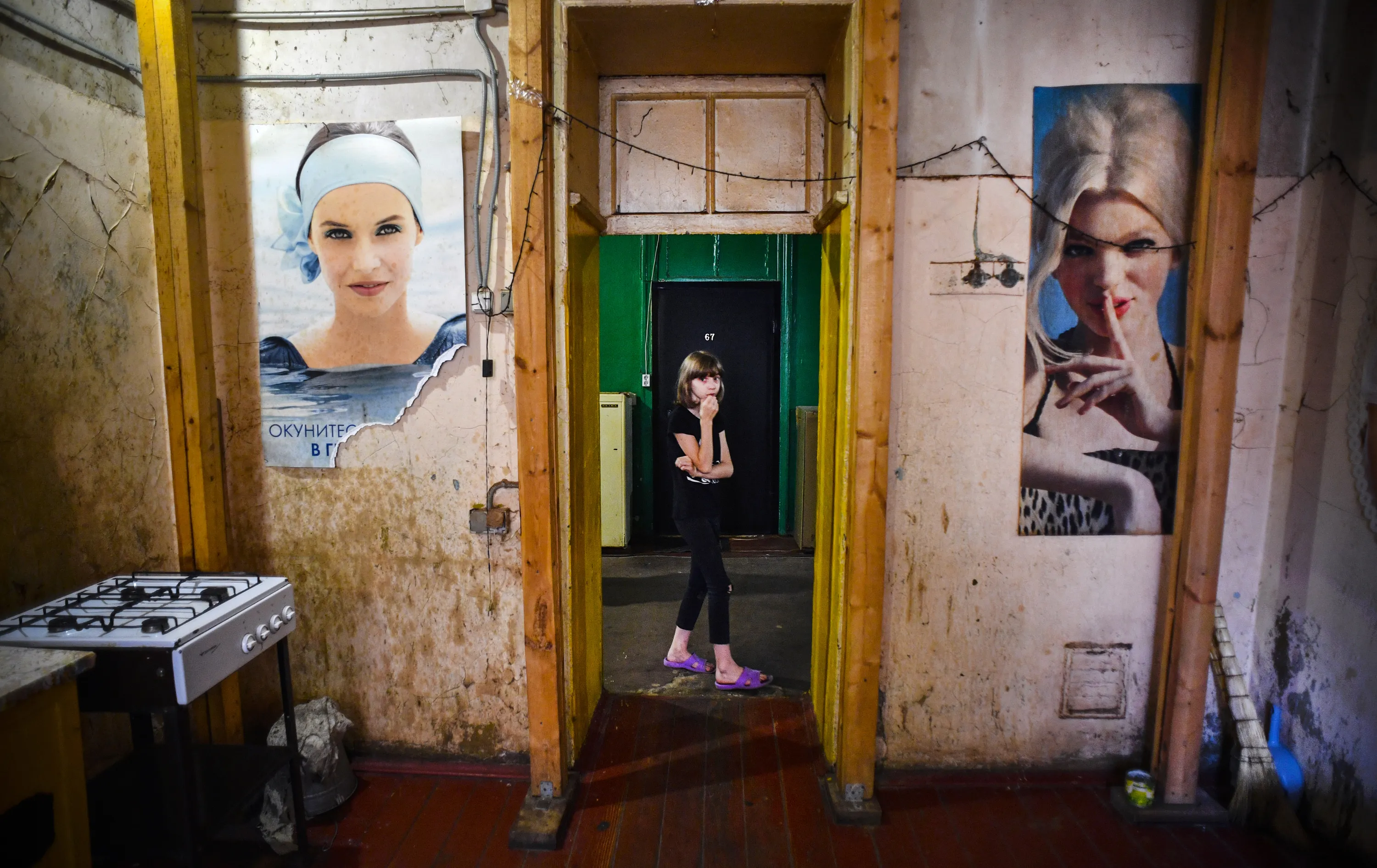 A girl walks past the entrance of a communal kitchen in a dormitory for the workers of Proletarka textile factory in the town of Tver, 200 kilometres north-west from Moscow on August 8, 2020. (Photo by Andrey Borodulin/AFP Photo)