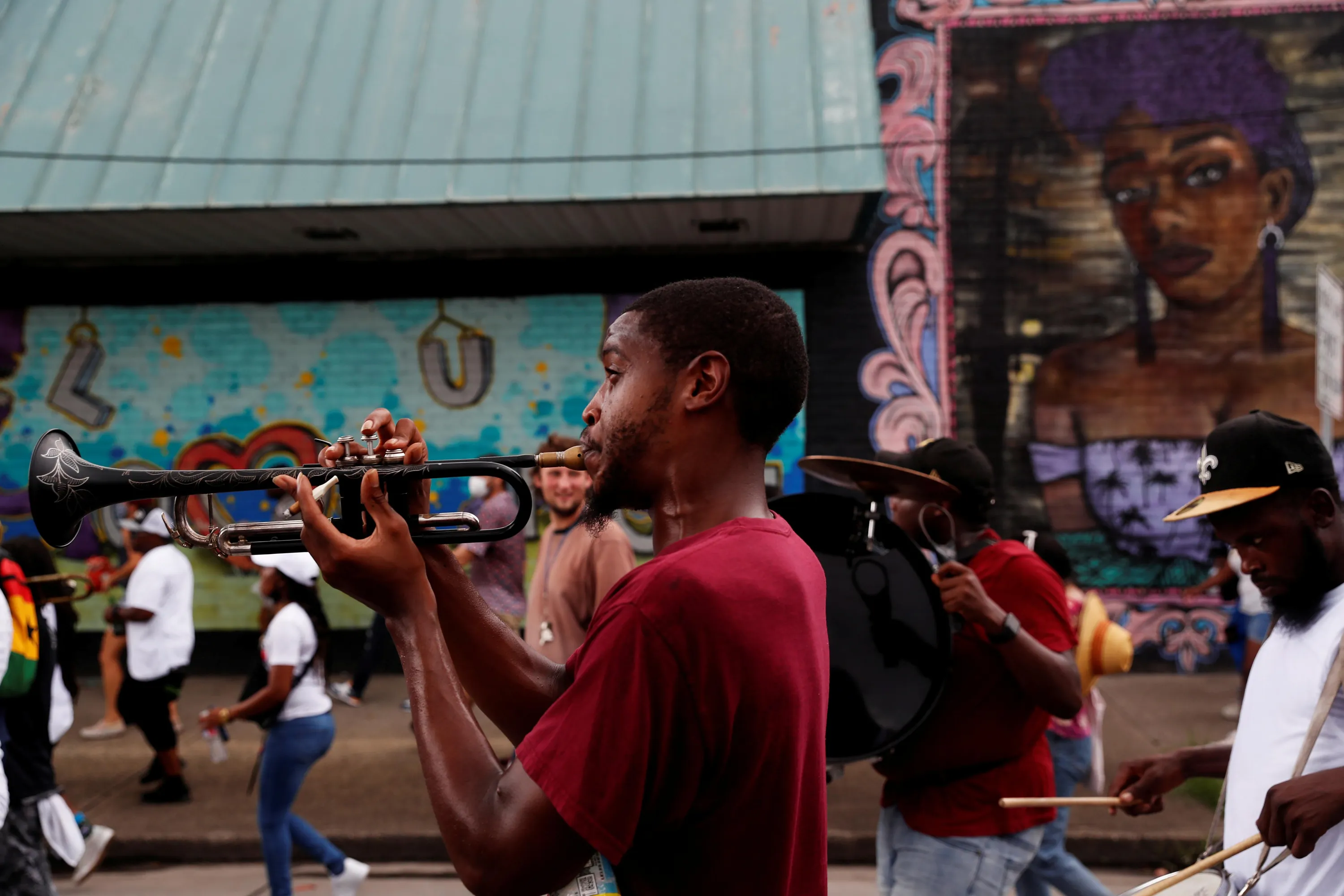 A man plays the trumpet during a march and Second Line to commemorate the 15th anniversary of Hurricane Katrina, in New Orleans, Louisiana, U.S. August 29, 2020. (Photo by Shannon Stapleton/Reuters)