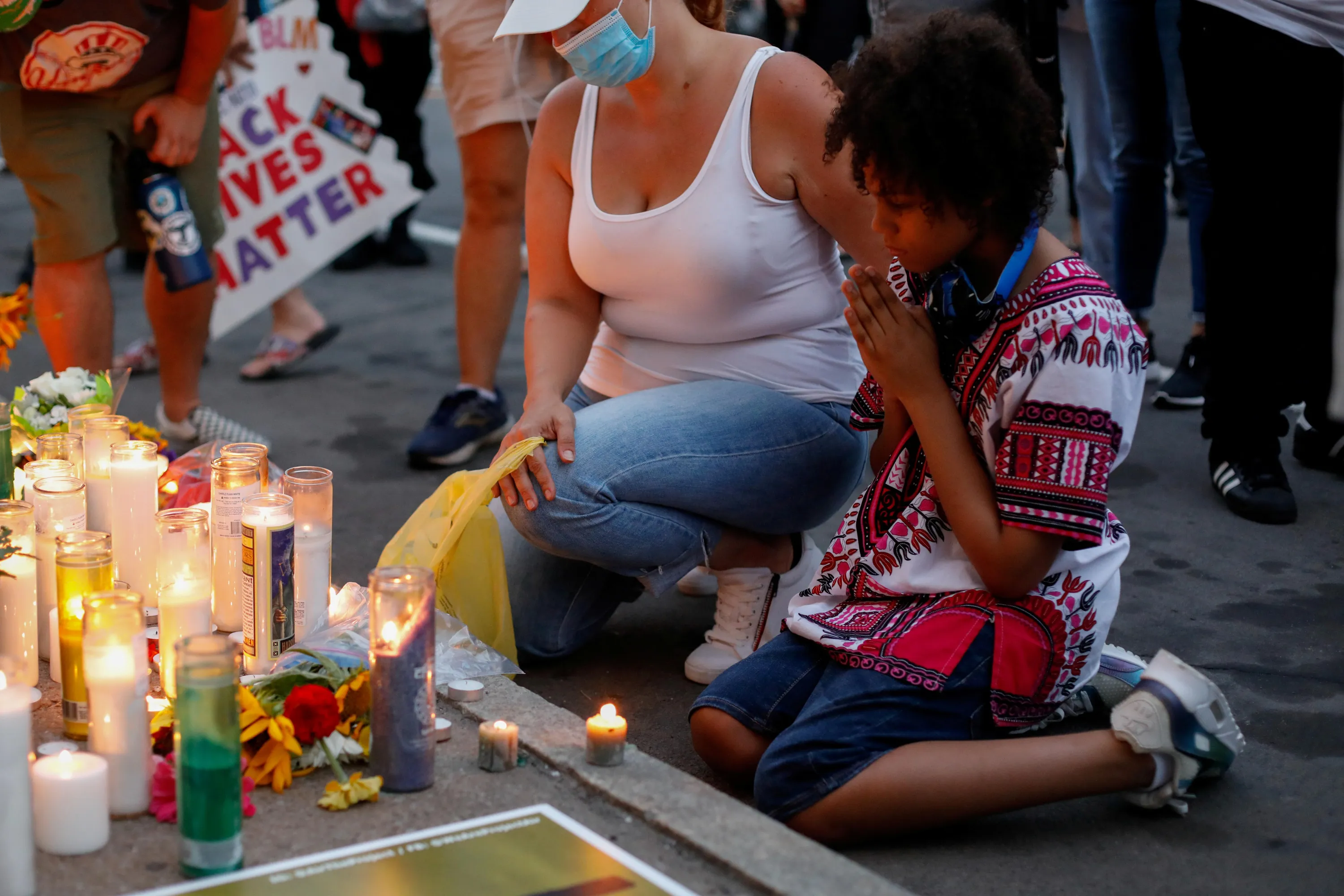 Demonstrators kneel in front of a memorial during a protest following the death of a Black man, Daniel Prude, after police put a spit hood over his head during an arrest on March 23, in Rochester, New York, U.S. September 3, 2020. (Photo by Lindsay DeDario/Reuters)