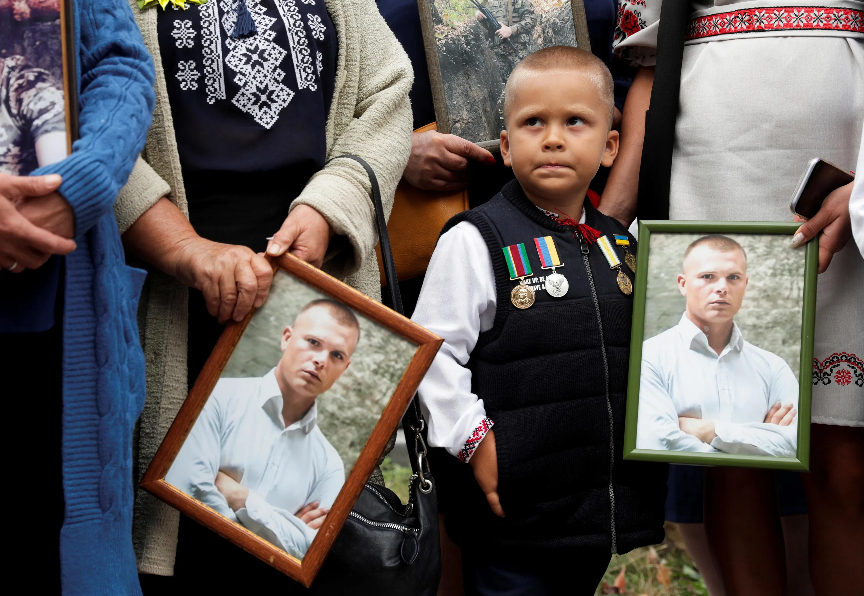 Relatives hold portraits of Ukrainian serviceman, who was killed in the conflict in eastern Ukraine, during a rally to commemorate the 6th anniversary of the Battle of Ilovaisk, ahead of the Day of Remembrance of Ukraine's Defenders, in front of the Russian embassy in Kyiv, Ukraine on August 28, 2020. (Photo by Valentyn Ogirenko/Reuters)