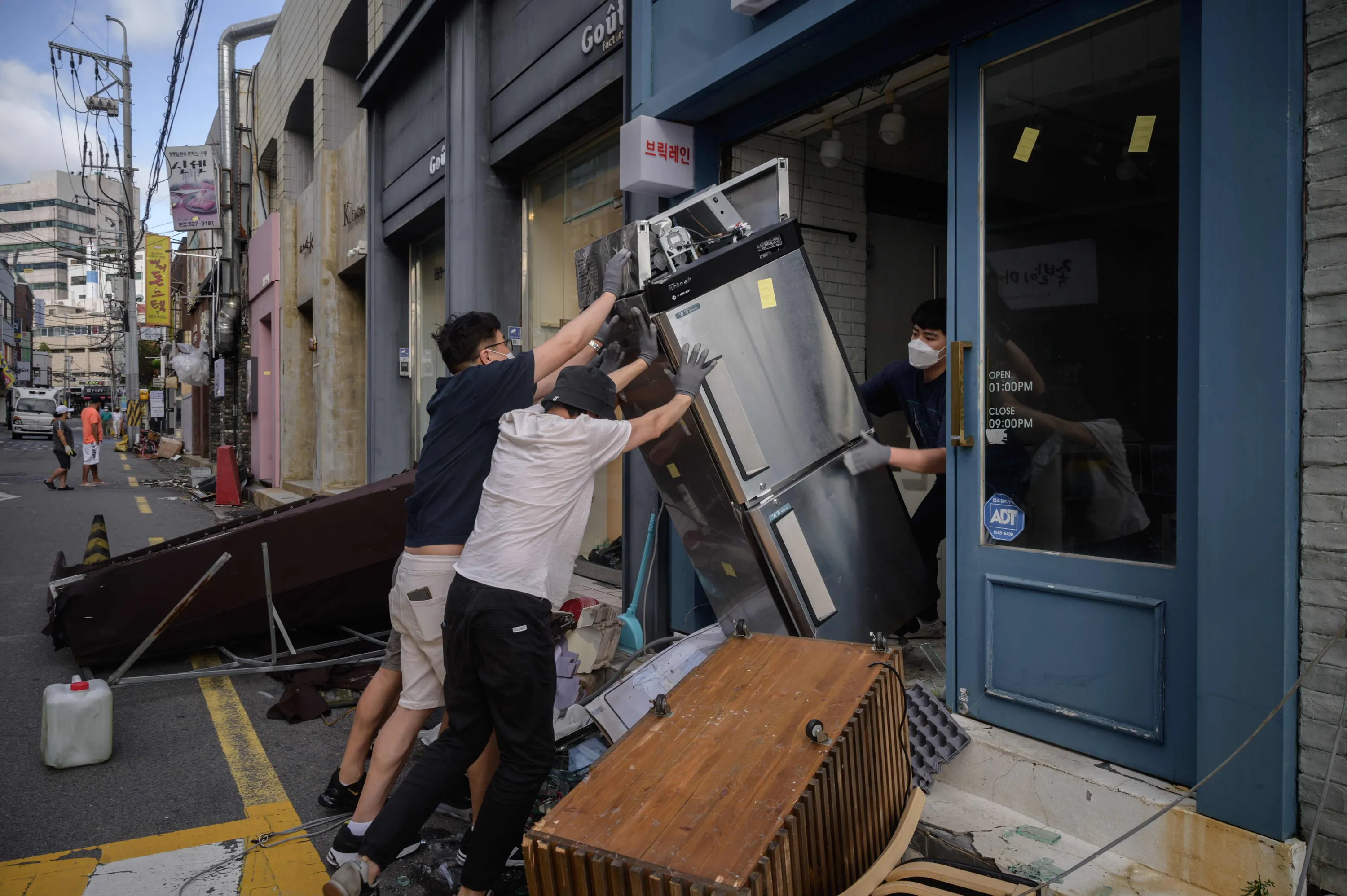 Store workers clean up damage to a shop caused by typhoon Maysak in Busan on September 3, 2020. At least one person was killed and more than 2,000 people evacuated to temporary shelters in South Korea as a powerful typhoon churned across the peninsula, authorities said. (Photo by Ed Jones/AFP Photo)