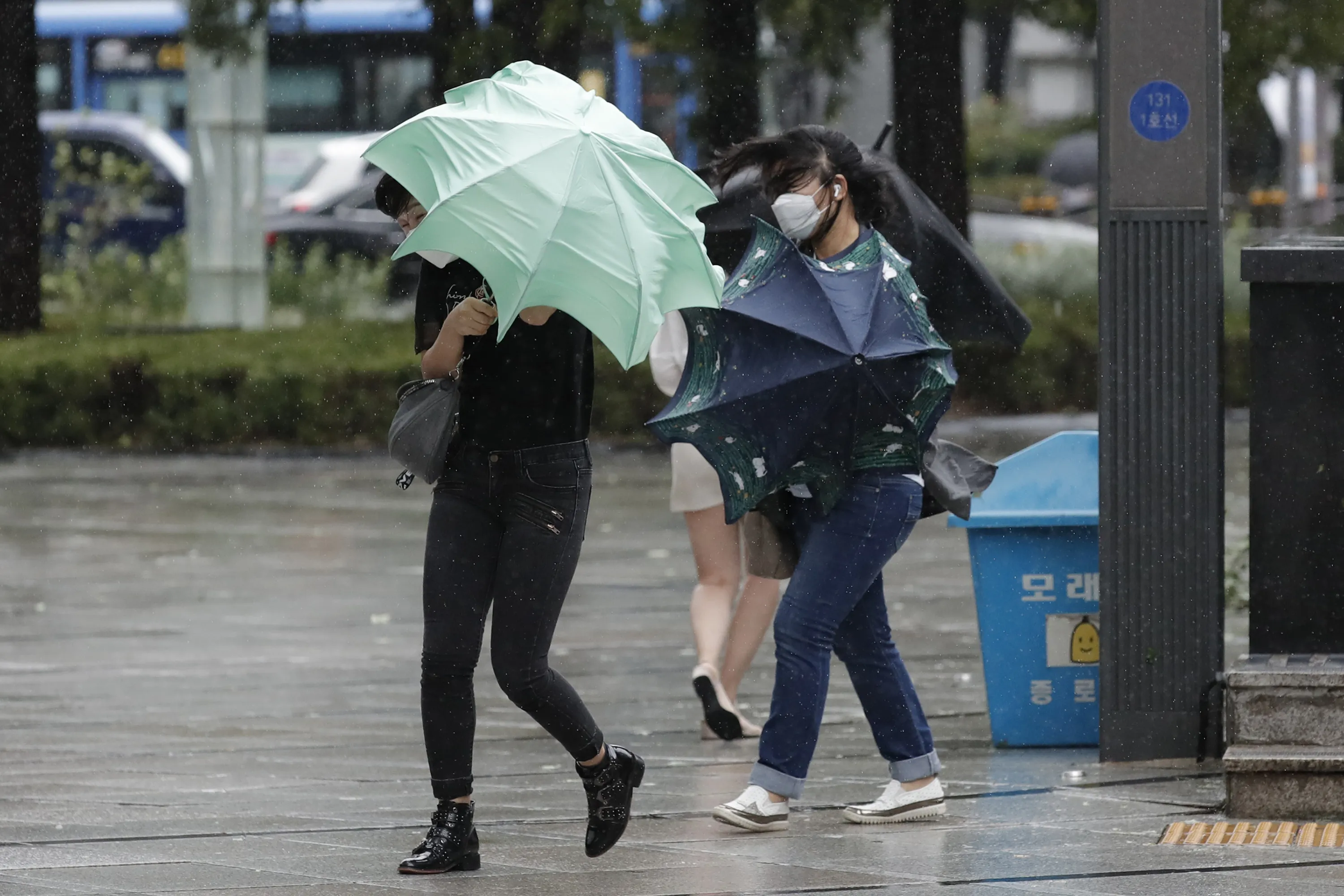 People struggle with their umbrellas against strong wind and rain in downtown Seoul, South Korea, Thursday, September 3, 2020. A powerful typhoon ripped through South Korea’s southern and eastern coasts with tree-snapping winds and flooding rains Thursday, knocking out power to thousands of homes. (Photo by Lee Jin-man/AP Photo)