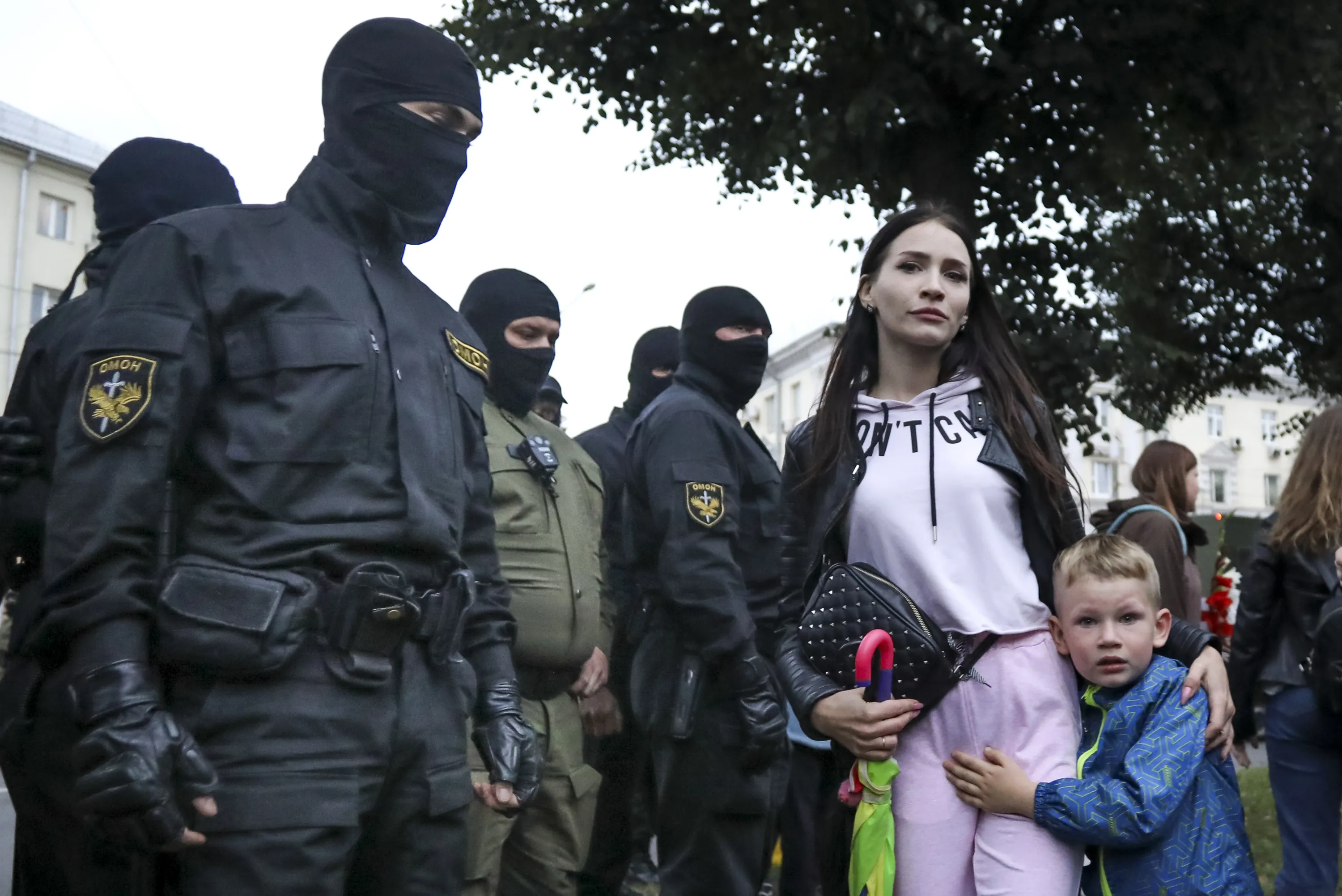 A woman with her child react as police officers detain protesters during a rally in support of Maria Kolesnikova, a member of the Coordination Council created by the opposition to facilitate talks with Lukashenko on a transition of power, was detained Monday in the capital of Minsk with two other council members, in Minsk, Belarus, Tuesday, September 8, 2020. A leading opposition activist in Belarus is being held on the border with Ukraine after she resisted attempts by authorities to deport her from the country as part of a clampdown on protests against authoritarian President Alexander Lukashenko. (Photo by AP Photo/Stringer)