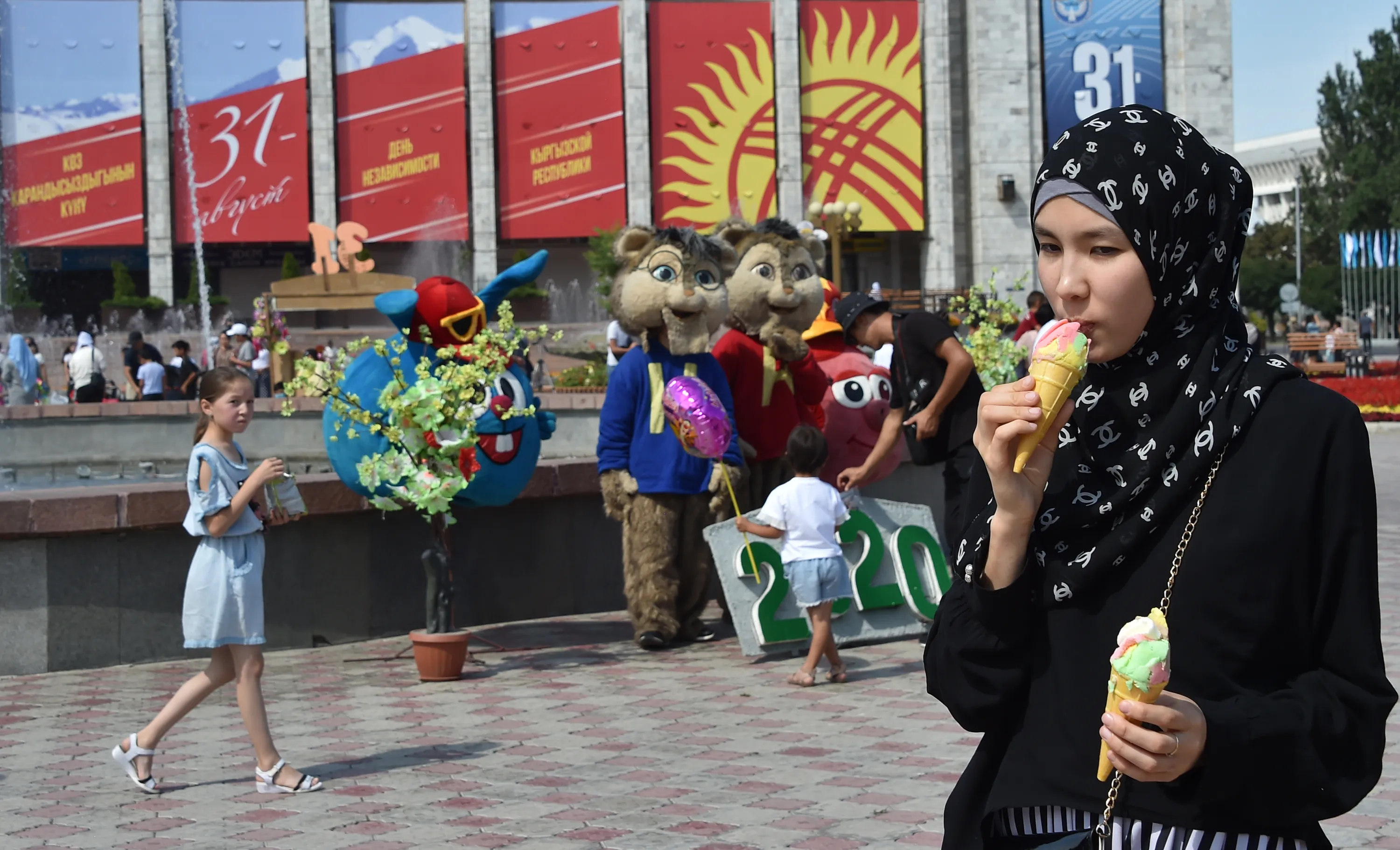 A Kyrgyz woman enjoys ice cream during the celebrations marking the 29th anniversary of Kyrgyzstan's independence from the Soviet Union at the Ala-Too Square in Bishkek on August 31, 2020. (Photo by Vyacheslav Oseledko/AFP Photo)