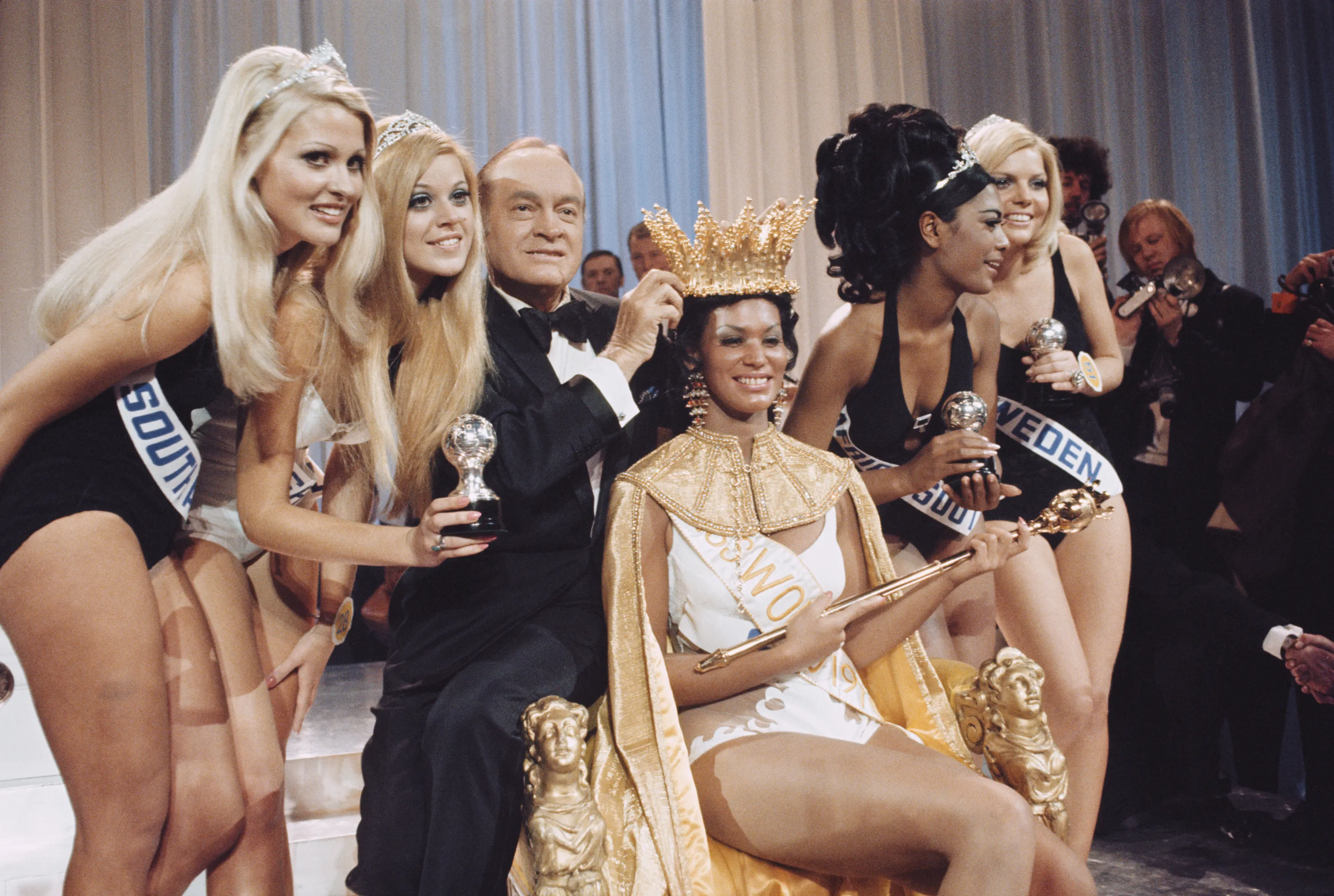 Winner of the Miss World 1970 beauty pageant, Jennifer Hosten from Grenada is crowned by American entertainer and host Bob Hope (1903-2003) as she sits on the winner's throne surrounded by the four runners up, from left to right, Miss South Africa Jillian Jessup, Miss Israel Irith Lavi, Miss Africa South Pearl Jansen and Miss Sweden Marjorie Christel Johansson at the Royal Albert Hall in London on 20th November 1970. (Photo by Rolls Press/Popperfoto via Getty Images/Getty Images)