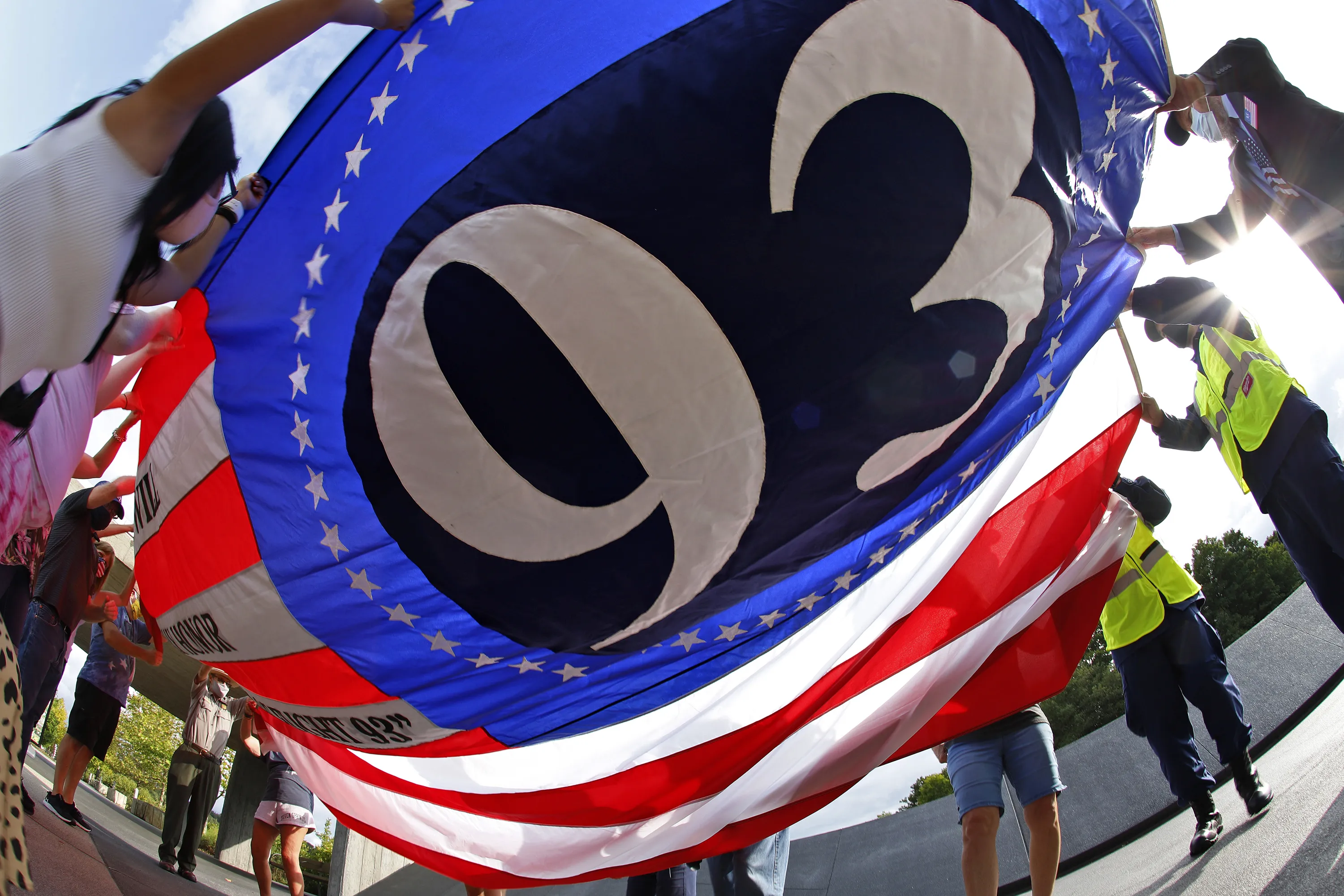 Visitors to the Flight 93 National Memorial in Shanksville, Pa., unfold a flag commemorating Flight 93 for a memorial service on Thursday, September 10, 2020, as the nation prepares to mark the 19th anniversary of the Sept. 11, 2001, attacks. (Photo by Gene J. Puskar/AP Photo)