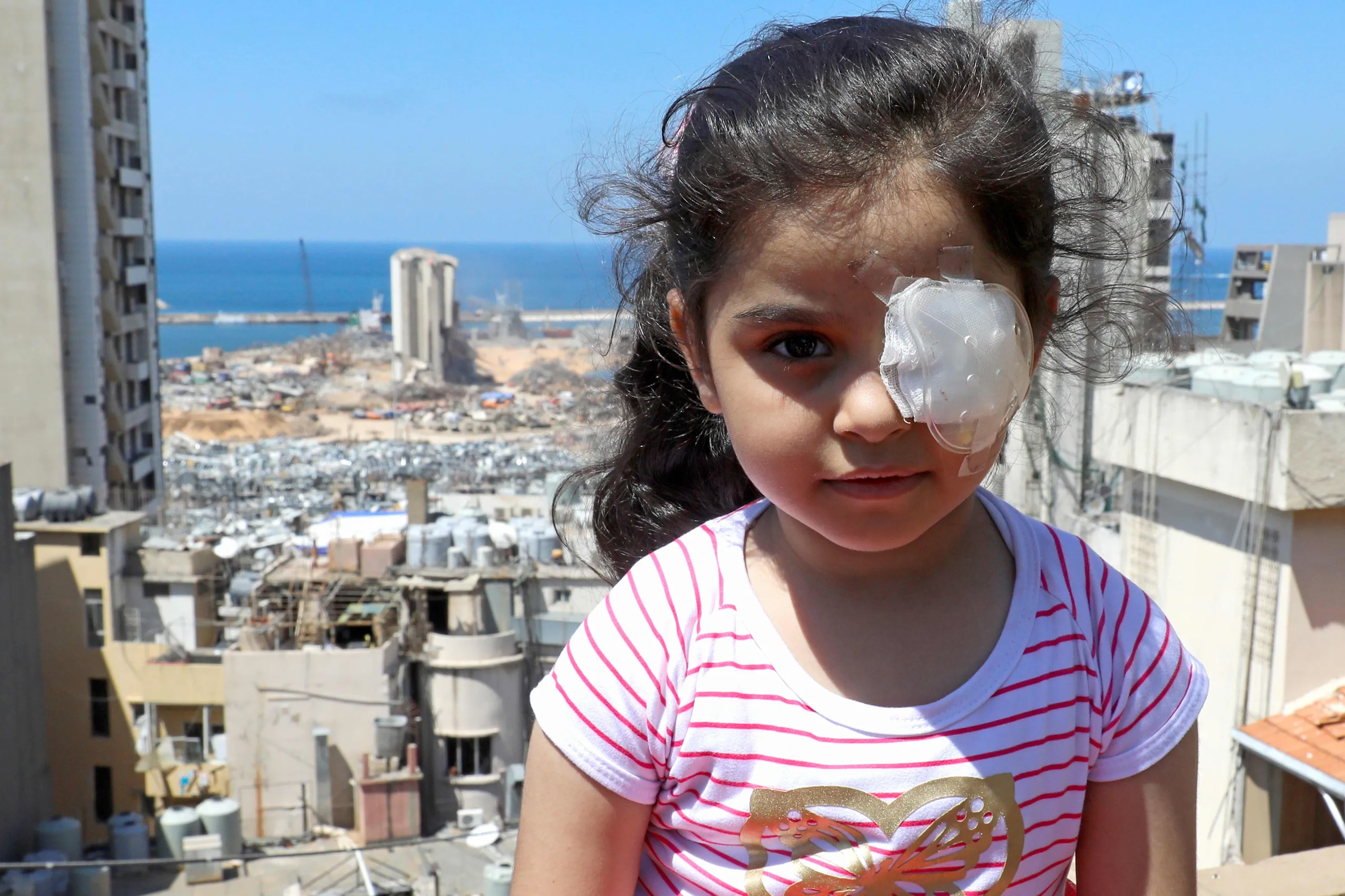Sama al-Hamad, 6-year-old Syrian girl who lost her left eye in the August 4 cataclysmic explosion, poses for a picture on the roof of her damaged house in Beirut's Mar Mikhael district overlooking the blast site on August 15, 2020. The powerful August 4 explosion that killed 177 people and devastated swathes of the Lebanese capital also left thousands wounded, mostly from flying shards of glass. At least 400 people suffered ocular injuries, more than 50 required surgery, and at least 15 were permanently blinded in one eye, according to data compiled by major hospitals in and around Beirut. (Photo by Anwar Amro/AFP Photo)