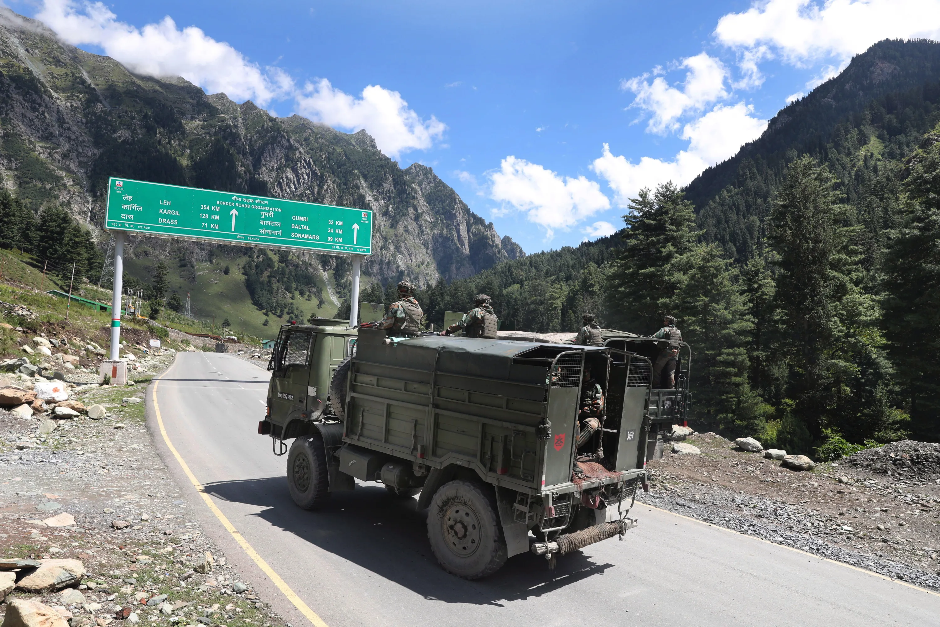 Indian army vehicles move along a highway leading to Ladakh, at Gagangeer some 81 kilometers from Srinagar, the summer capital of Indian Kashmir, 07 September 2020 (issued 10 September 2020). Apart from nomadic families with goats, sheep and horses, no one is allowed to travel along the normally bustling mountain road to allow the Indian military to operate freely amid a months-long standoff between India and China along the disputed border in eastern Ladakh. (Photo by Farooq Khan/EPA/EFE)