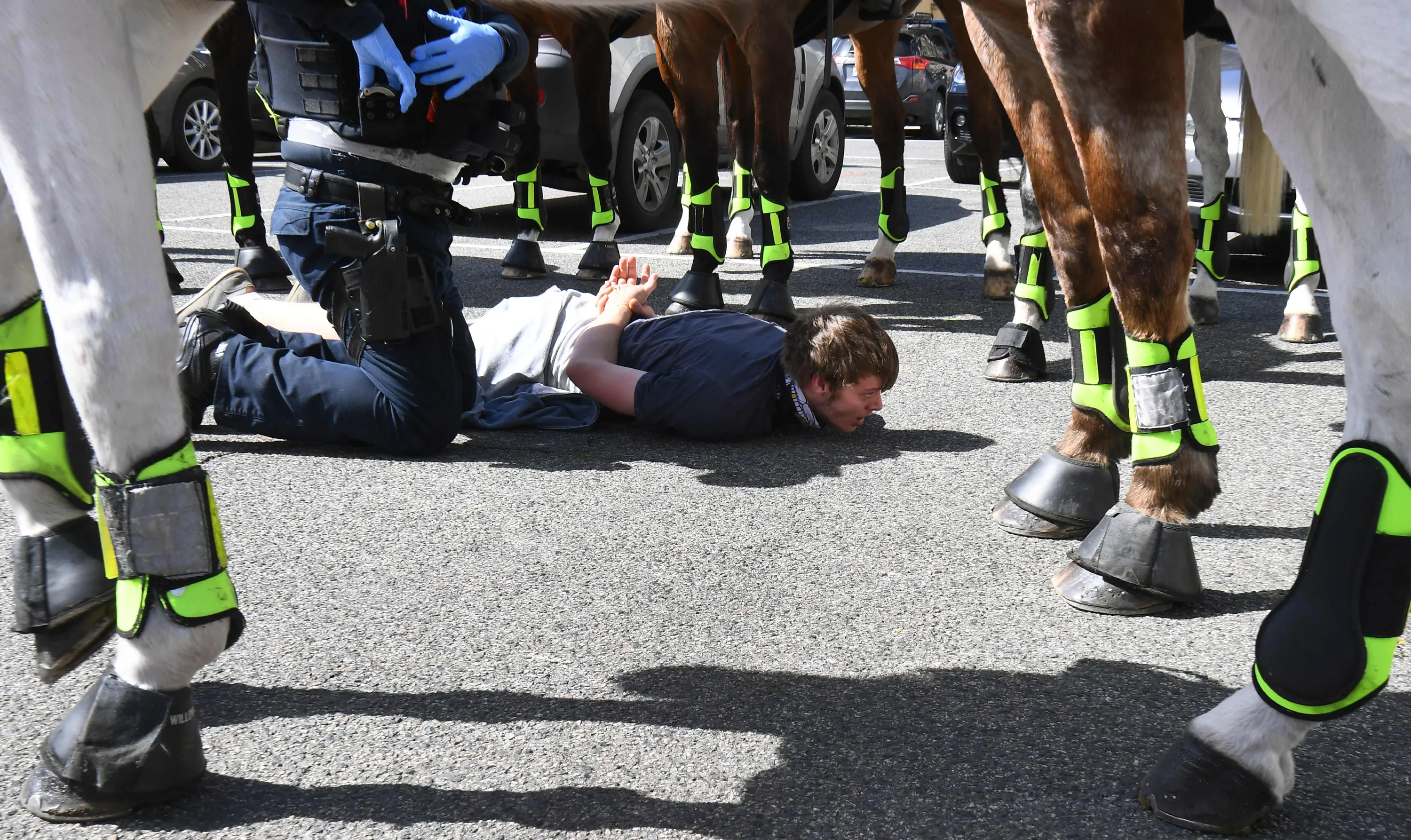 Police detain an anti-lockdown protester at Melbourne's Queen Victoria Market during a rally on September 13, 2020, amid the ongoing COVID-19 coronavirus pandemic. Melbourne continues to enforce strict lockdown measures to battle a second wave of the coronavirus. (Photo by William West/AFP Photo)