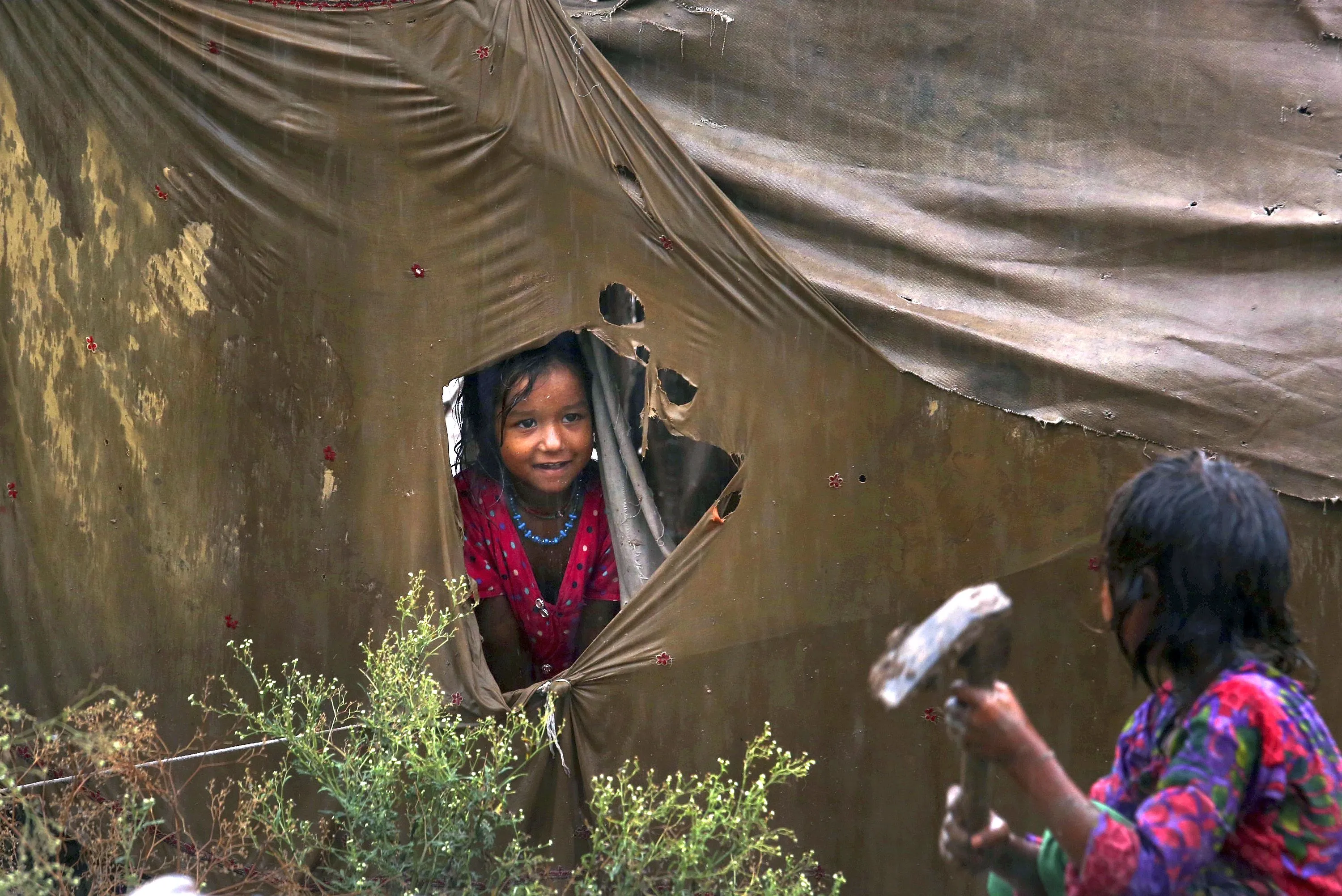 A nomadic girl talks to her sister from a hole in a ripped tent during rainfall at a slum in Peshawar, Pakistan, Tuesday, September 1, 2020. (Photo by Muhammad Sajjad/AP Photo)