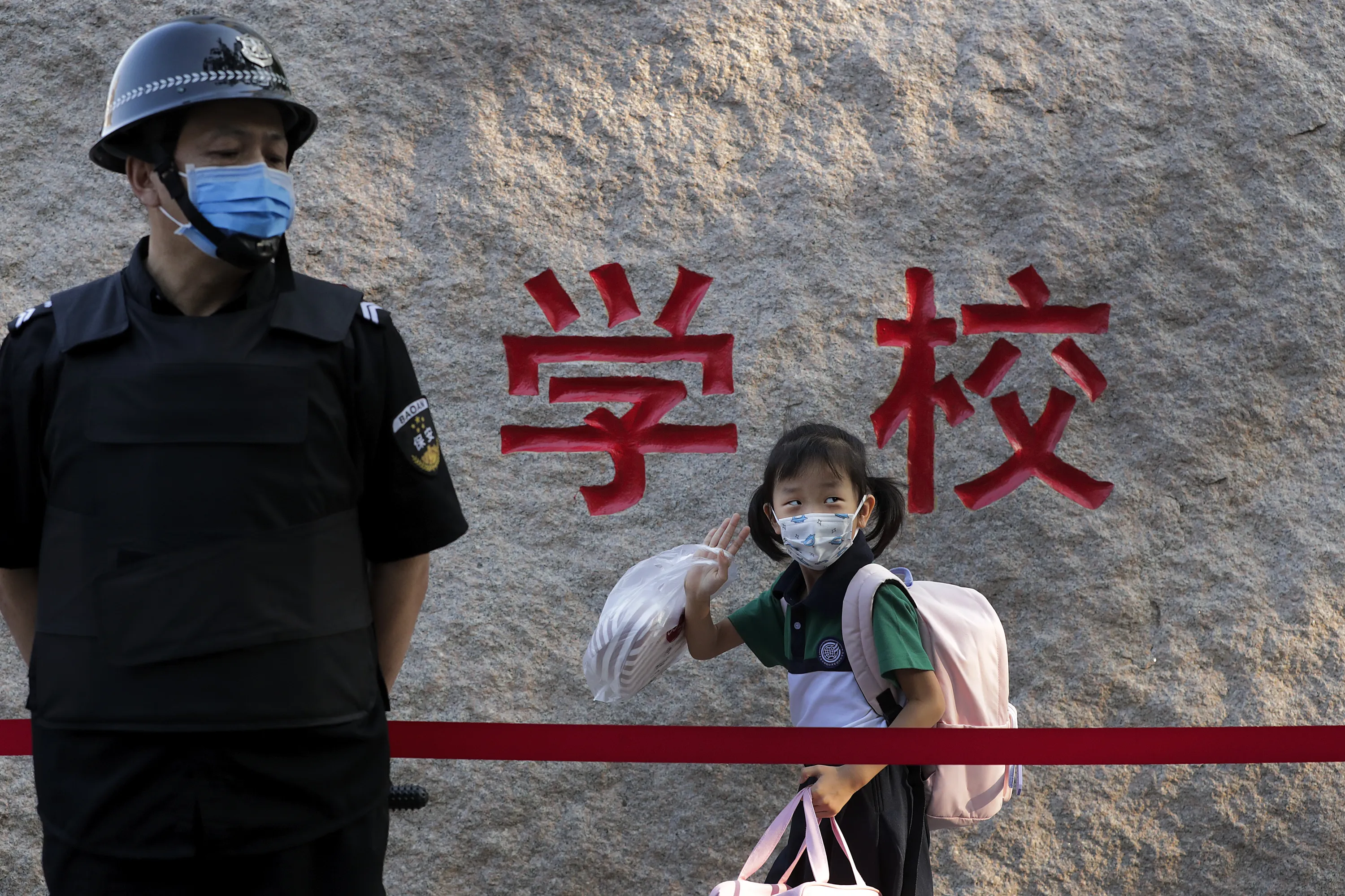 A student wearing a face mask to help curb the spread of the coronavirus waves next to a masked security guard as she arrives to a primary school in Beijing, Monday, September 7, 2020. Students in the capital city returned to school on Monday in a staggered start to the new school year because of the coronavirus outbreak. (Photo by Andy Wong/AP Photo)