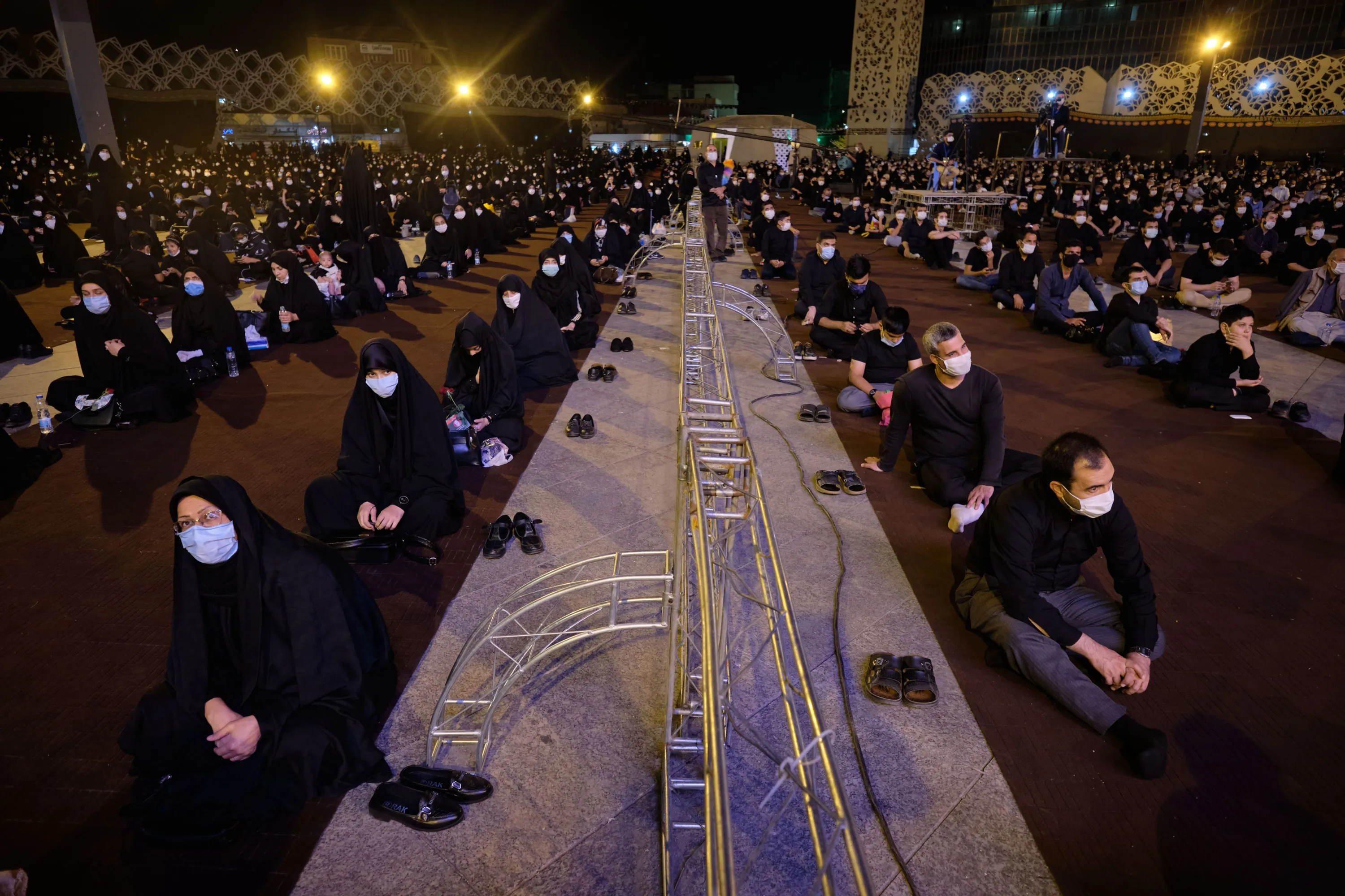 Men (R) and women wearing protective face masks separated from each other by a fence during a Moharram religious ceremony in the Imam Hussein square in southern Tehran on August 25, 2020. Shiite mourners have attended a religious ceremony to mark the holy month of Moharram while Health officials urged religious leaders to follow health protocols to prevent further outbreaks of the new coronavirus disease. (Photo by Morteza Nikoubazl/NurPhoto via Getty Images)