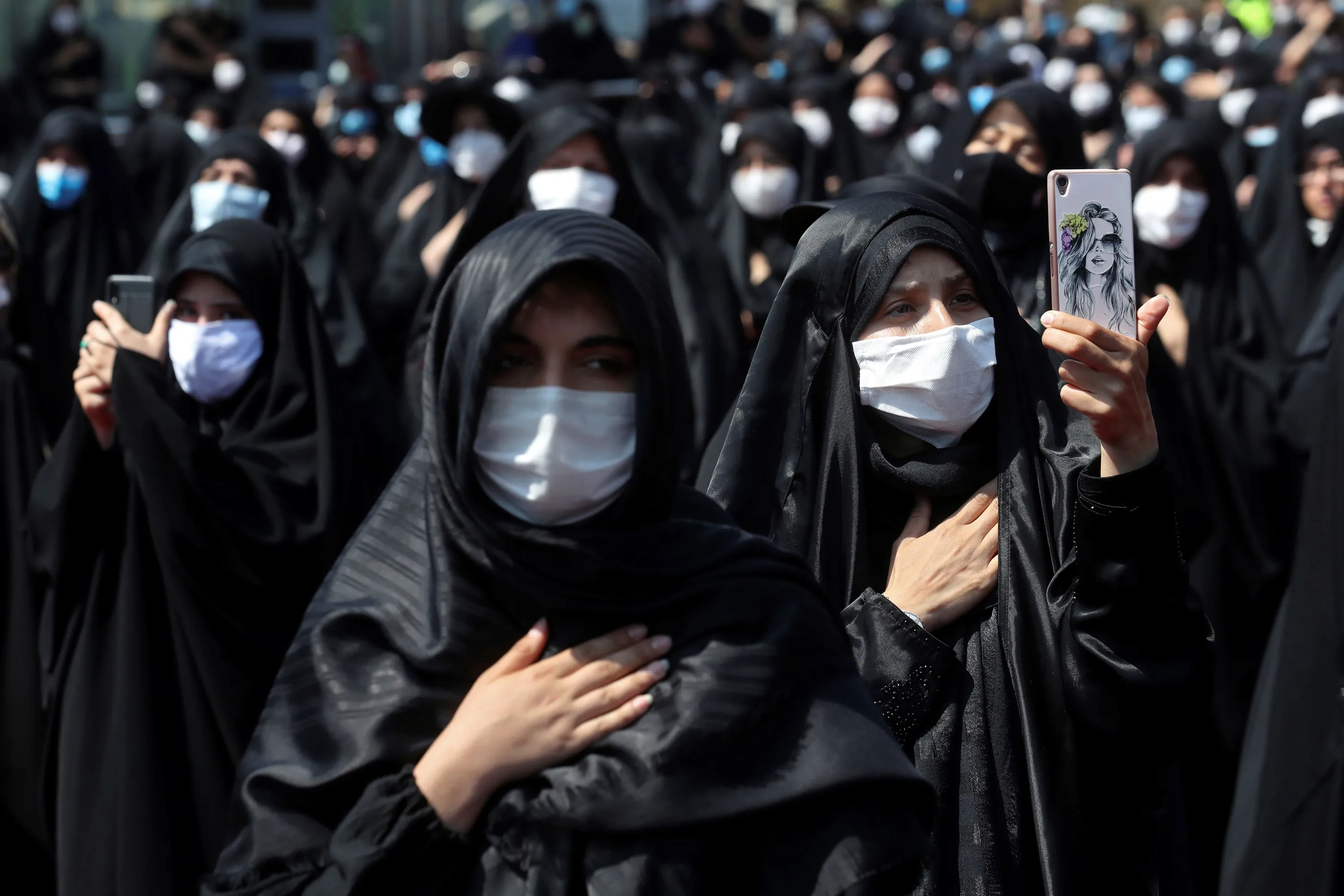 People wearing protective face masks to help prevent spread of the coronavirus mourn during an annual ceremony commemorating Ashoura, the anniversary of the 7th century death of Imam Hussein, a grandson of Prophet Muhammad, and one of Shiite Islam's most beloved saints, who was killed in a battle in Karbala in present-day Iraq, at the Saleh shrine in northern Tehran, Iran, Sunday, August 30, 2020. In Iran, which has the largest number of deaths from the coronavirus in the region, authorities allowed limited mourning rituals, urged social distancing and made wearing masks mandatory. (Photo by Ebrahim Noroozi/AP Photo)