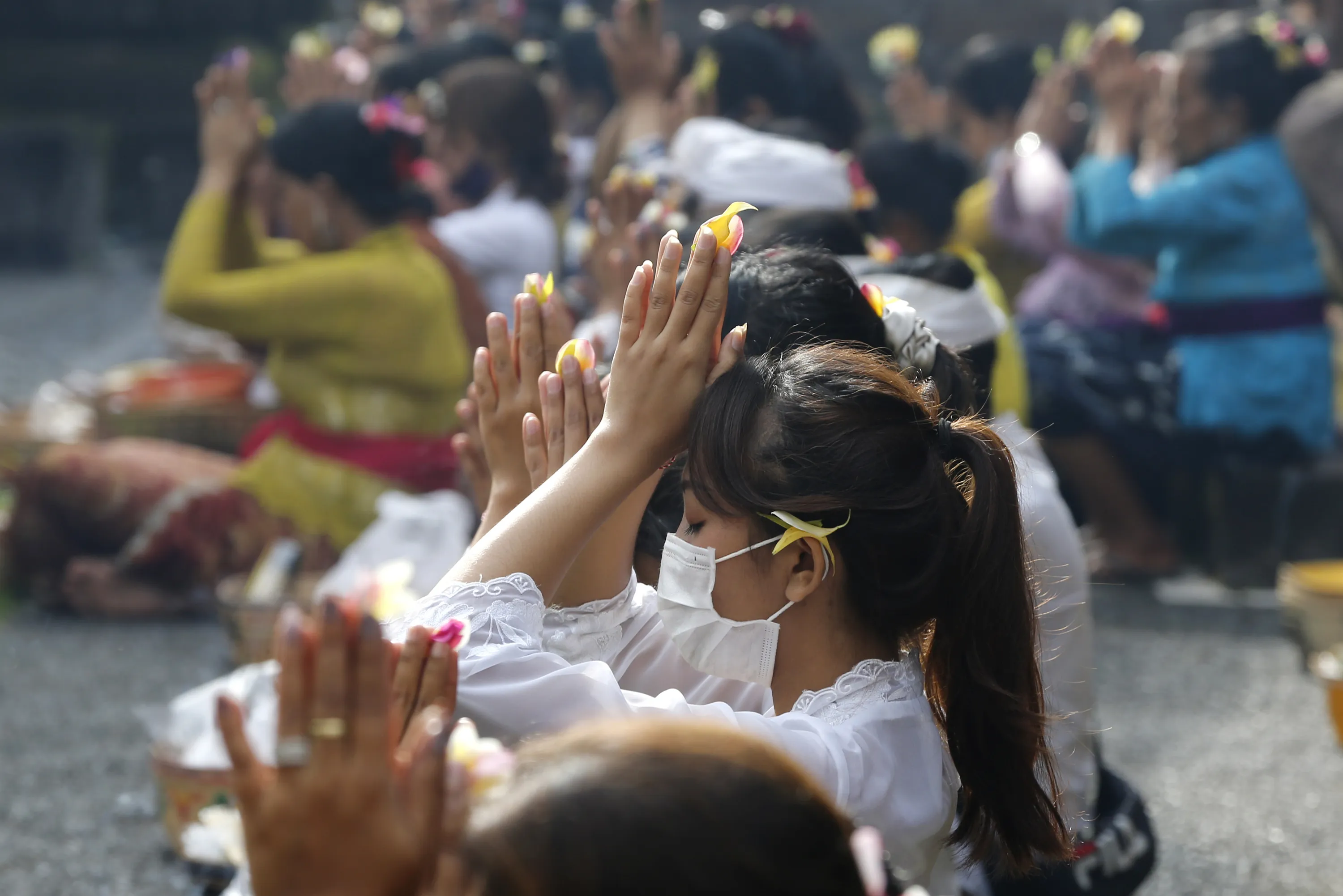 A woman wearing a face mask as a precaution against the new coronavirus outbreak during a Hindu ritual prayer at a temple in Bali, Indonesia on Wednesday, September 16, 2020. (Photo by Firdia Lisnawati/AP Photo)