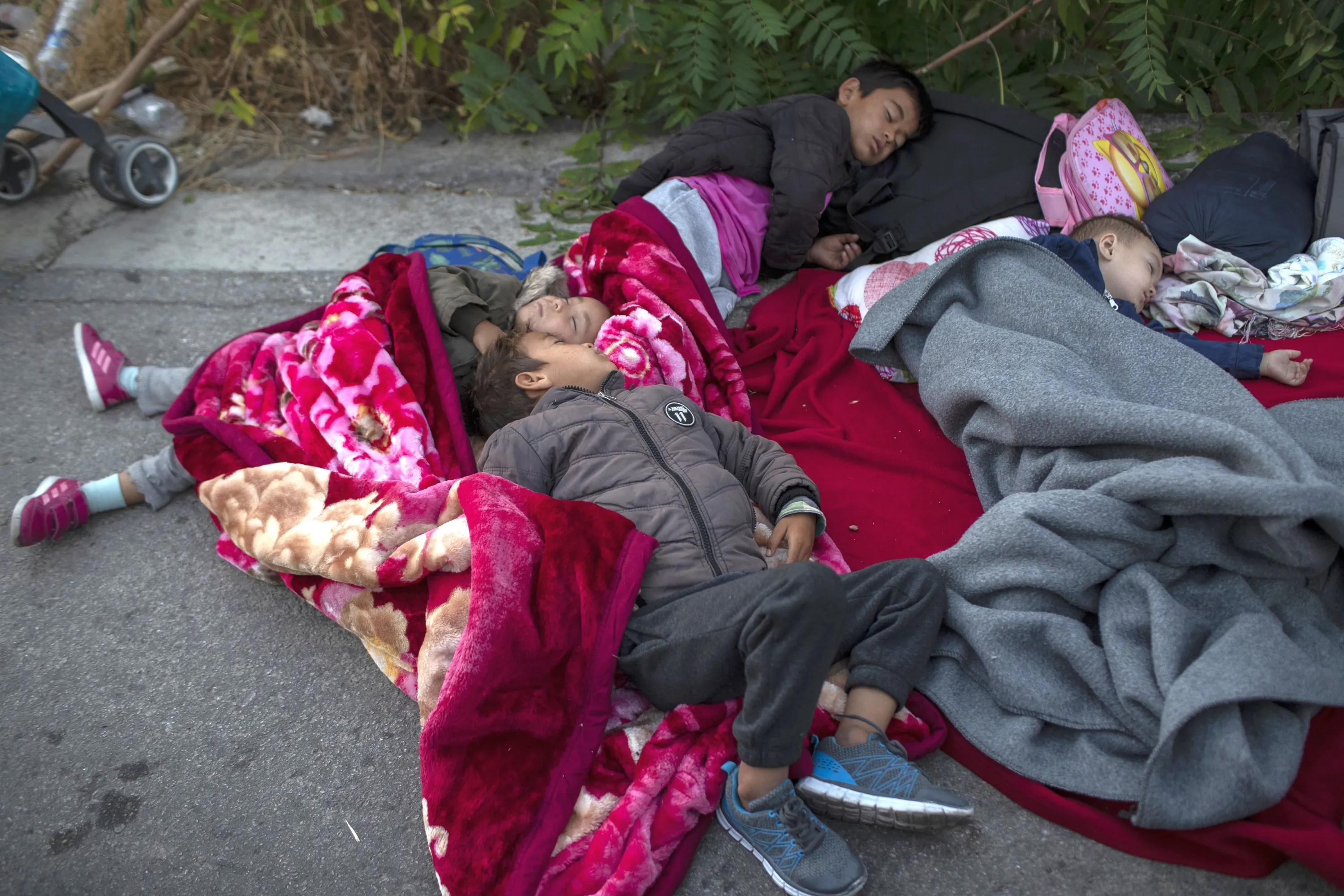 Migrants sleep on the road near the Moria refugee camp on the northeastern island of Lesbos, Greece, Thursday, September 10, 2020. A second fire in Greece's notoriously overcrowded Moria refugee camp destroyed nearly everything that had been spared in the original blaze, Greece's migration ministry said Thursday, leaving thousands more people in need of emergency housing. (Photo by Petros Giannakouris/AP Photo)