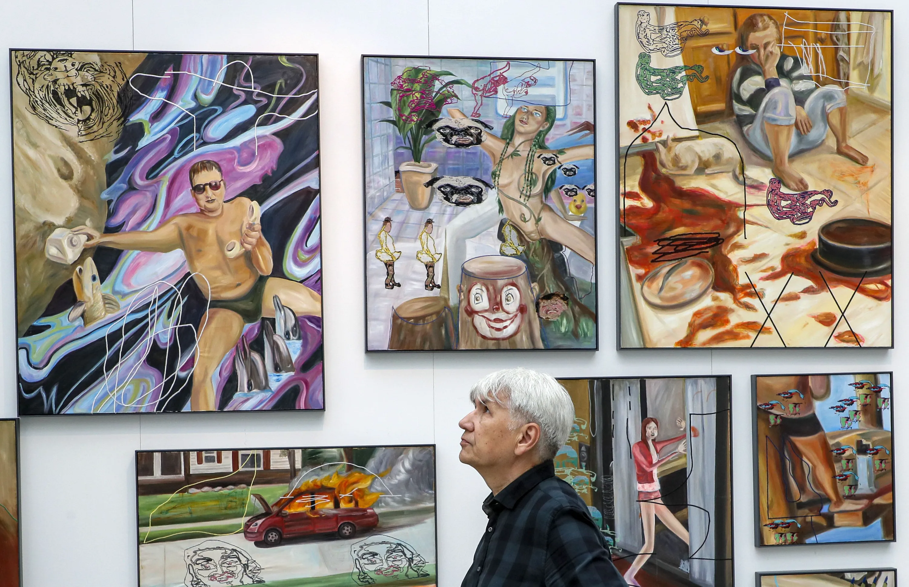 A visitor examines artworks by Ivan Gorshkov during the Cosmoscow international fair in Moscow, Russia, 10 September 2020. More than 200 contemporary artists take part Cosmoscow international fair is an annual contemporary art festival that runs from 10 to 13 September 2020. (Photo by Sergei Ilnitsky/EPA/EFE)