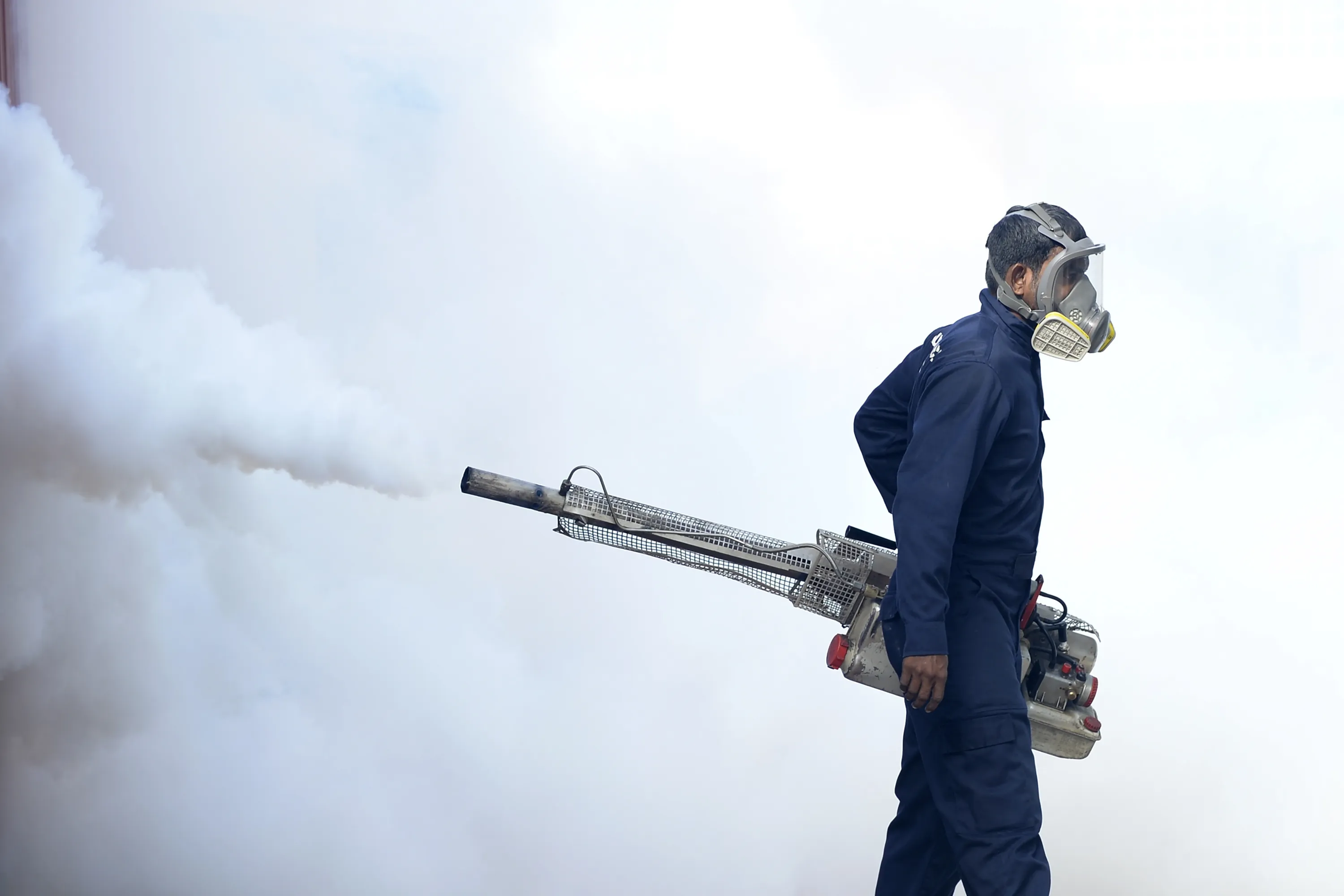 A municipal worker fumigates an area to kill off mosquitos inside the Lumbini school in Colombo on September 15, 2020. (Photo by Lakruwan Wanniarachchi/AFP Photo)