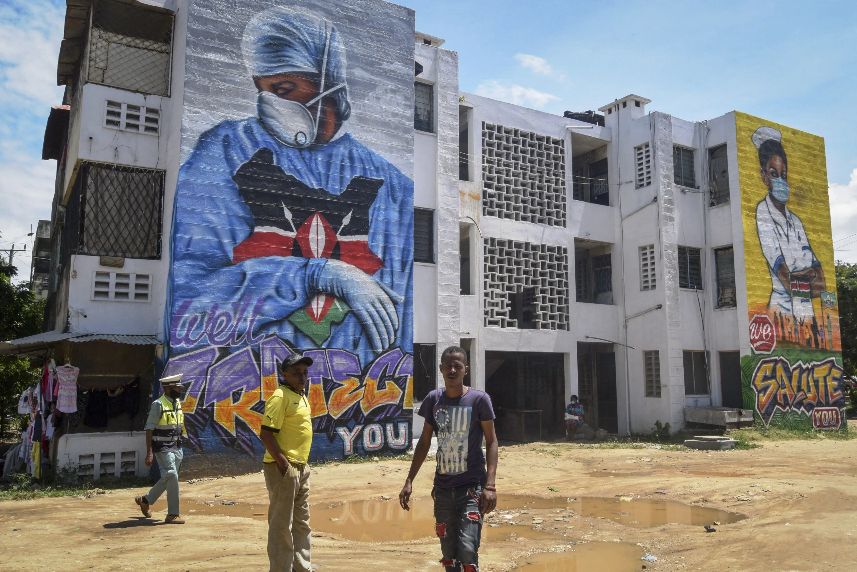 Residents walk in front of informational murals painted on the side of an apartment block about the coronavirus and paying tribute to medical workers with the messages “We'll Protect You” and “We Salute You”, in the Buxton residential estate of the coastal city of Mombasa, Kenya, Monday, August 17, 2020. (Photo by AP Photo/Stringer)