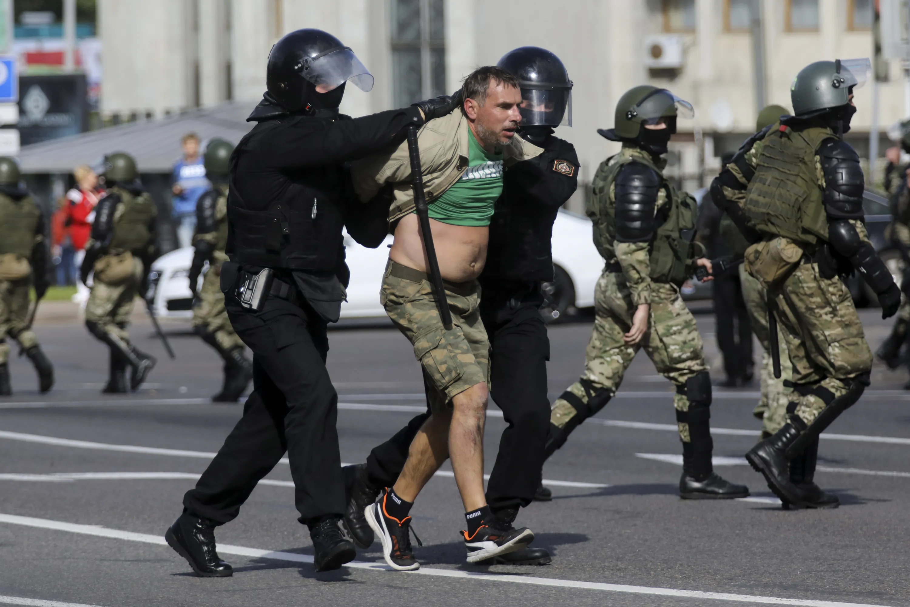 Riot police officers detain a protester during a Belarusian opposition supporters' rally protesting the official presidential election results in Minsk, Belarus, Sunday, September 13, 2020. (Photo by AP Photo/Stringer)