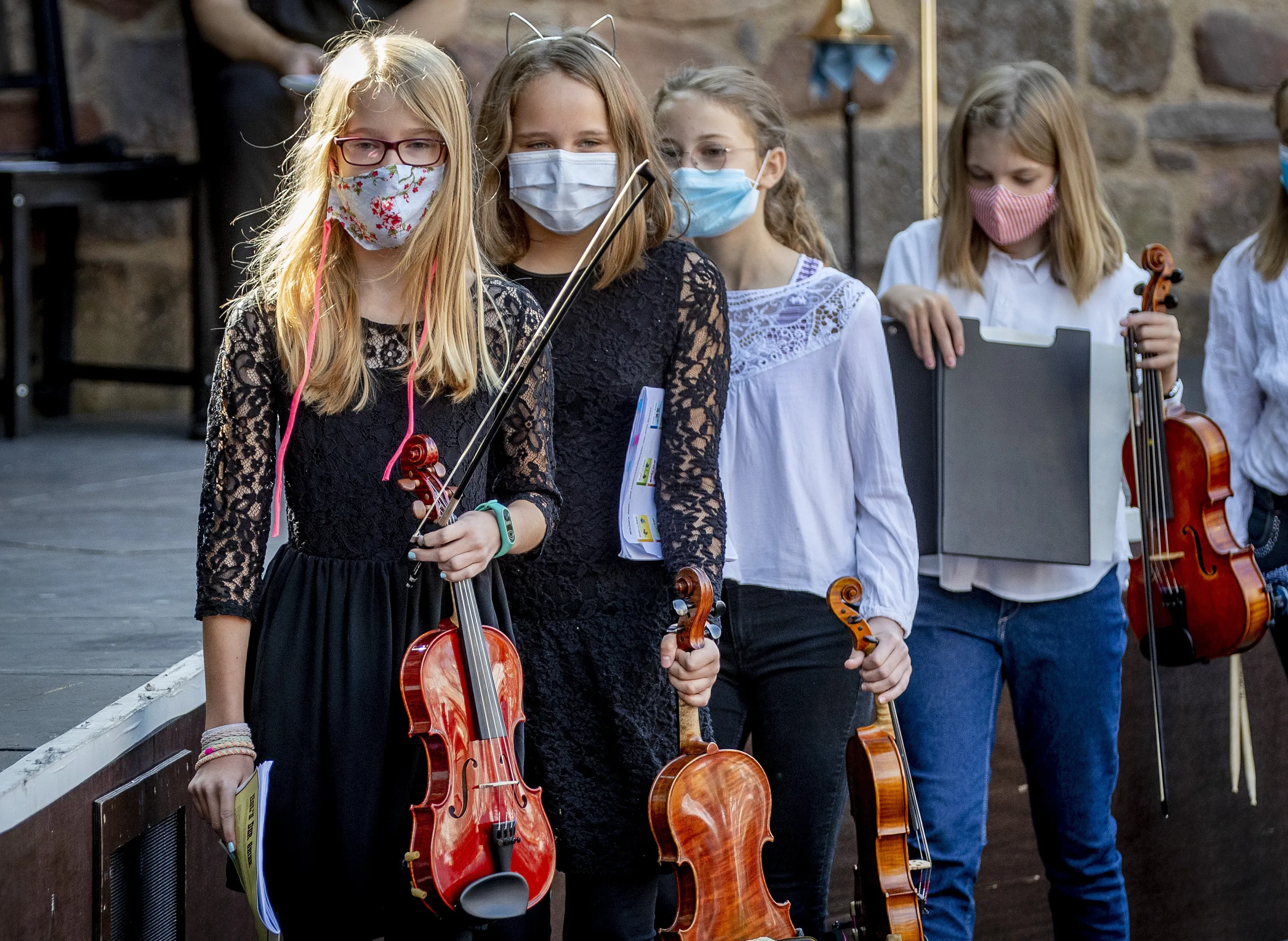 Young violinists wear face masks on the way to their music school concert in the old castle in Bad Vilbel near Frankfurt, Germany, Sunday, September 20, 2020. (Photo by Michael Probst/AP Photo)