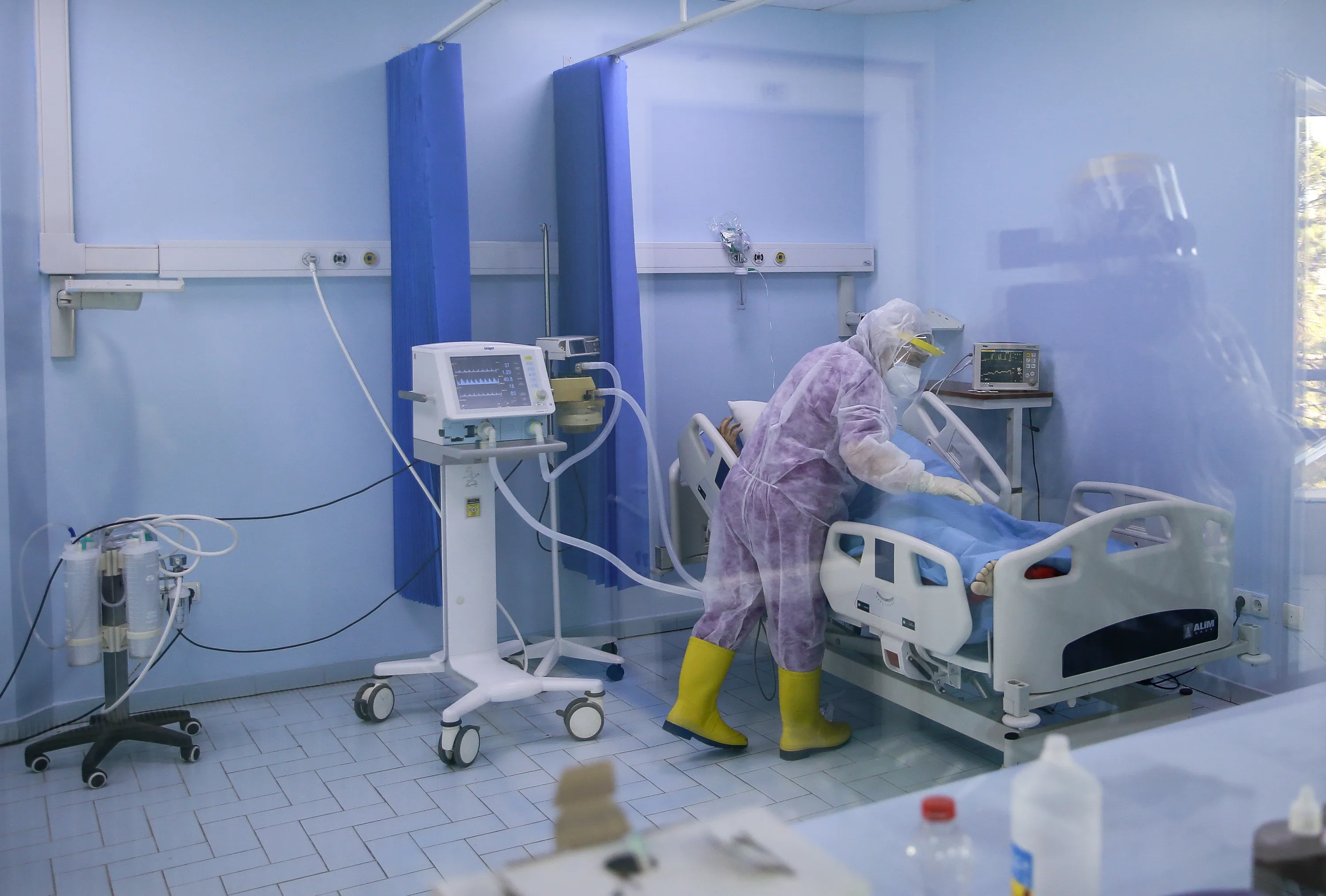 A nurse inside the Intensive Care Unit attends to a patient with COVID-19 in the Clinic for Infectious Diseases during the ongoing Coronavirus pandemic, in Pristina, Kosovo, Monday, September 21, 2020. Political pressure is growing in Europe for governments to tackle the rising number of coronavirus case without resorting to a spring-style lockdown that would hit the continent's struggling economies. (Photo by Visar Kryeziu/AP Photo)