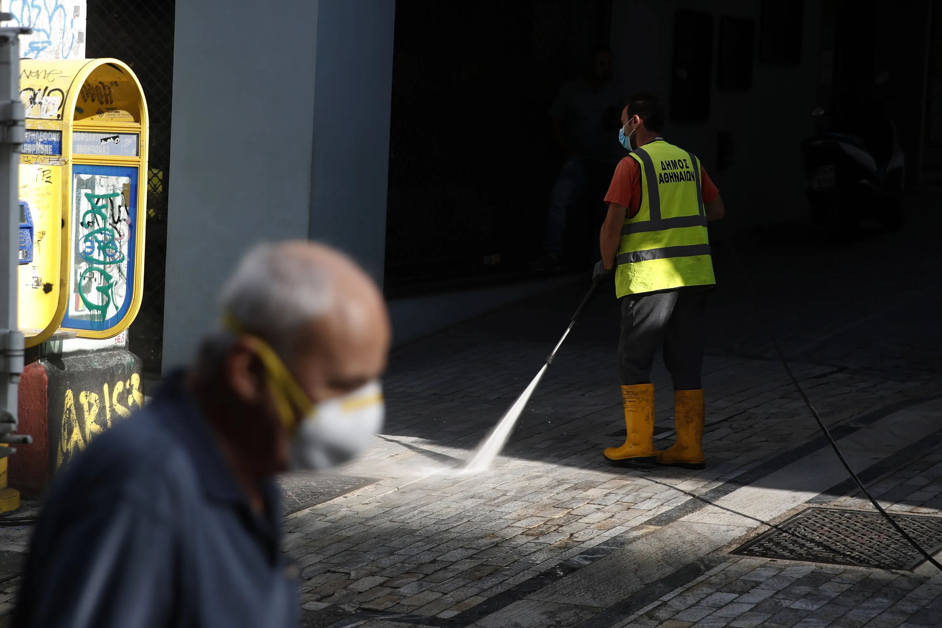 A municipal worker sprays disinfectant on a pavement as a man wearing face mask to prevent the spread of the new coronavirus walks at Ermou Street, Athens' main shopping area, Monday, September 21, 2020. Greece is tightening restrictions in the greater Athens region, stepping up testing and creating quarantine hotels due to an increase in COVID-19 infections after Athenians returned from their summer holidays. (Photo by Thanassis Stavrakis/AP Photo)