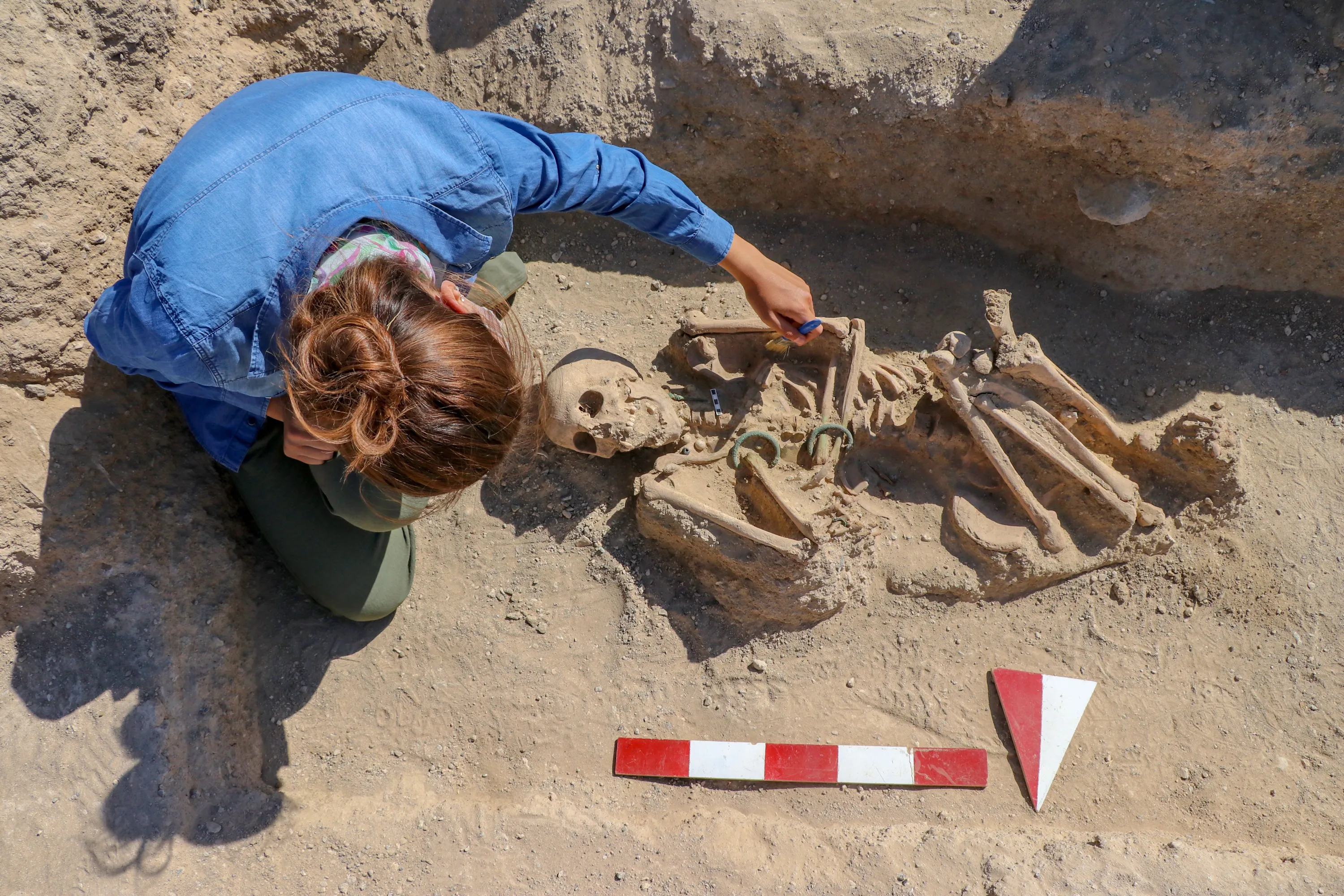 An archaeologist carries out excavation as a skeleton of a Royal Urartu woman buried with jewelry is found during the archaeological excavations at a necropolis of the Urartu period in Gurpinar district of Turkey's eastern Van province on August 31, 2020. Excavation works continue at the 2,750 year-old Necropolis, where aristocrats are believed to be buried. A royal woman skeleton was found wearing pendulum earrings, a ring on her finger, a necklace on her neck, an ornamental pin, and dragon-headed bracelets on her both arms. (Photo by Mesut Varol/Anadolu Agency via Getty Images)