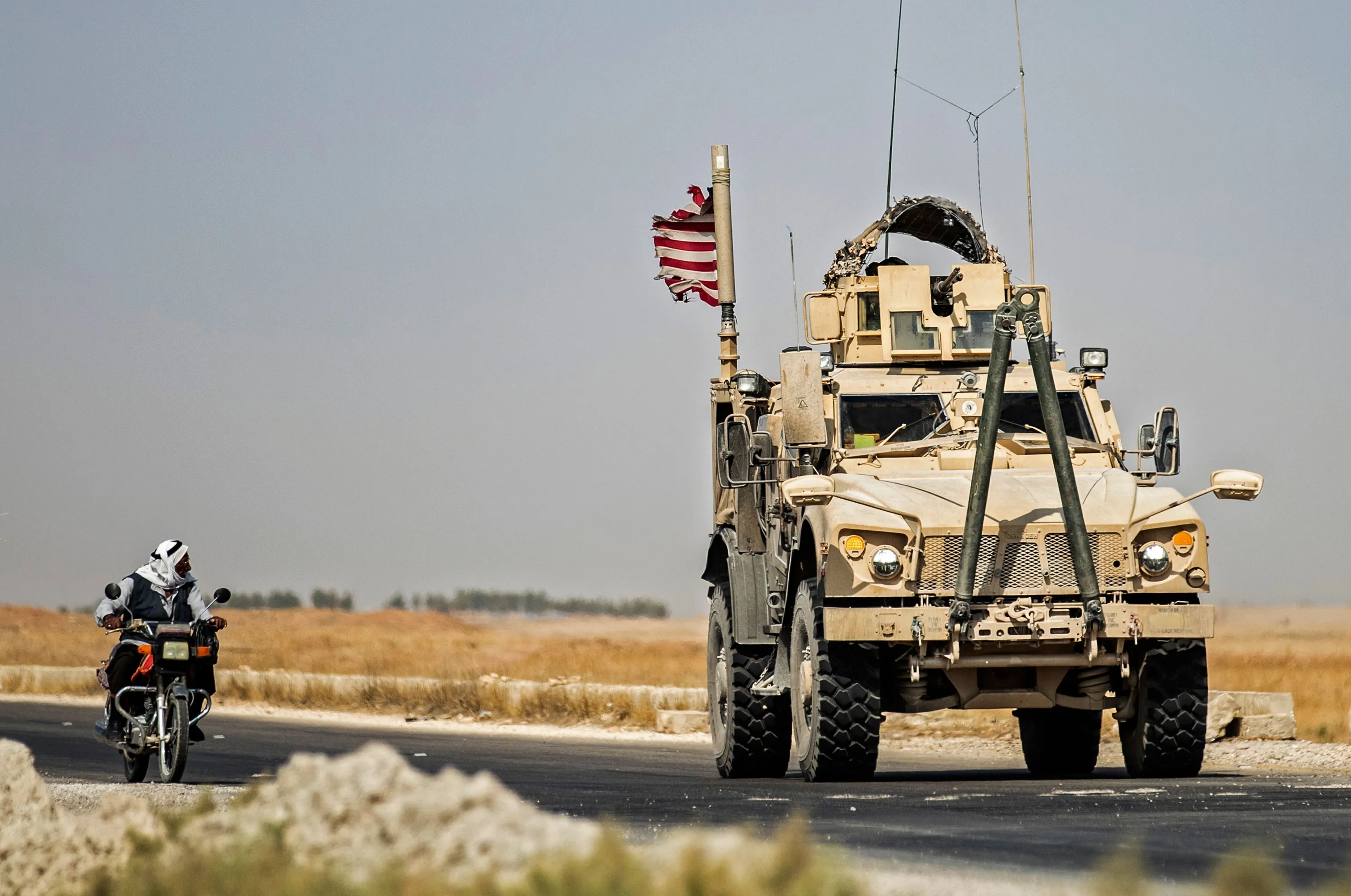 A Syrian man rides a motorcycle past a US military vehicle patrolling the town of Tal Tamr, in Syria's northeastern Hasakeh province, on September 21, 2020. (Photo by Delil Souleiman/AFP Photo)
