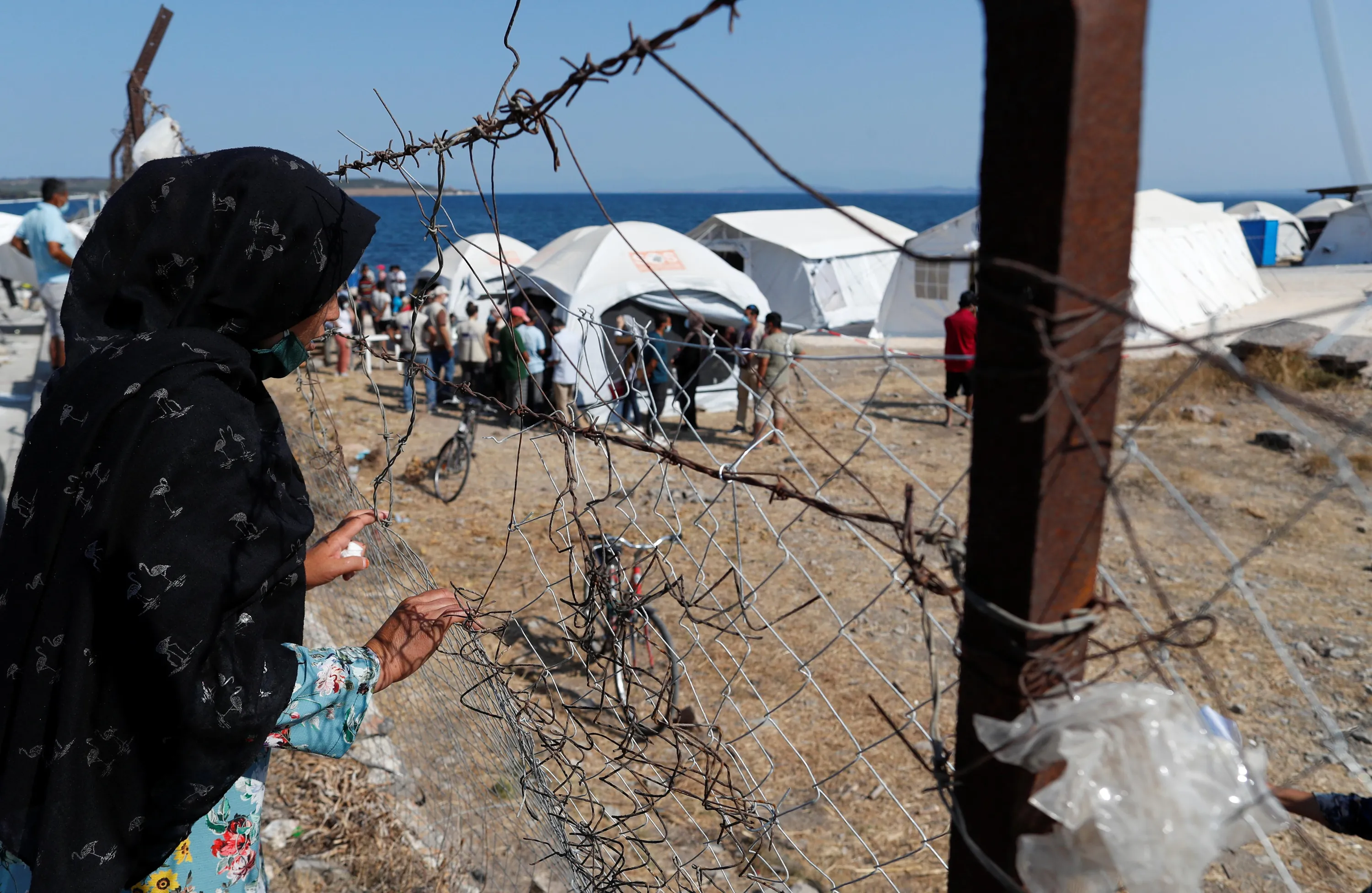 A woman looks through a chain-linked fence at a new temporary camp for migrants and refugees, on the island of Lesbos, Greece, September 22, 2020. (Photo by Yara Nardi/Reuters)