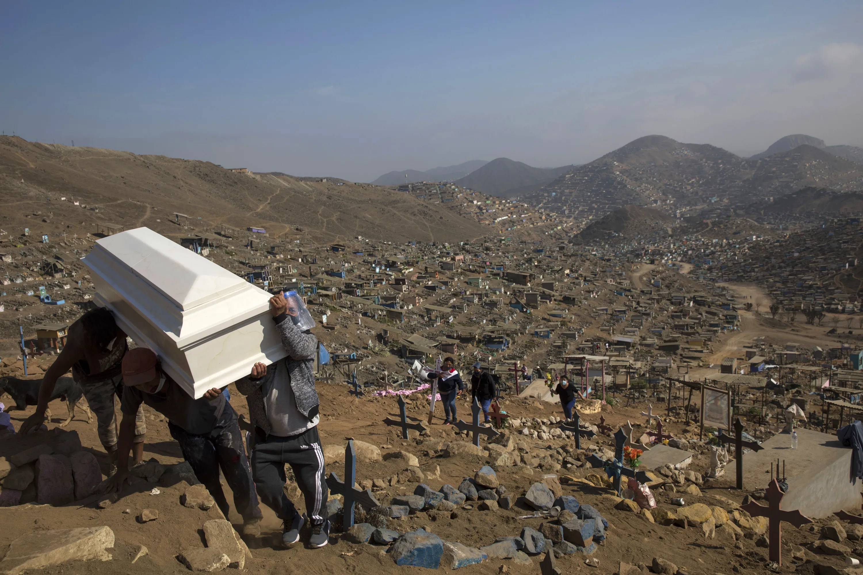 Relatives carry the coffin of a loved one during a burial in the section of the Nueva Esperanza cemetery reserved for COVID-19 cases, in the outskirts of Lima, Peru, Monday, September 21, 2020. (Photo by Rodrigo Abd/AP Photo)