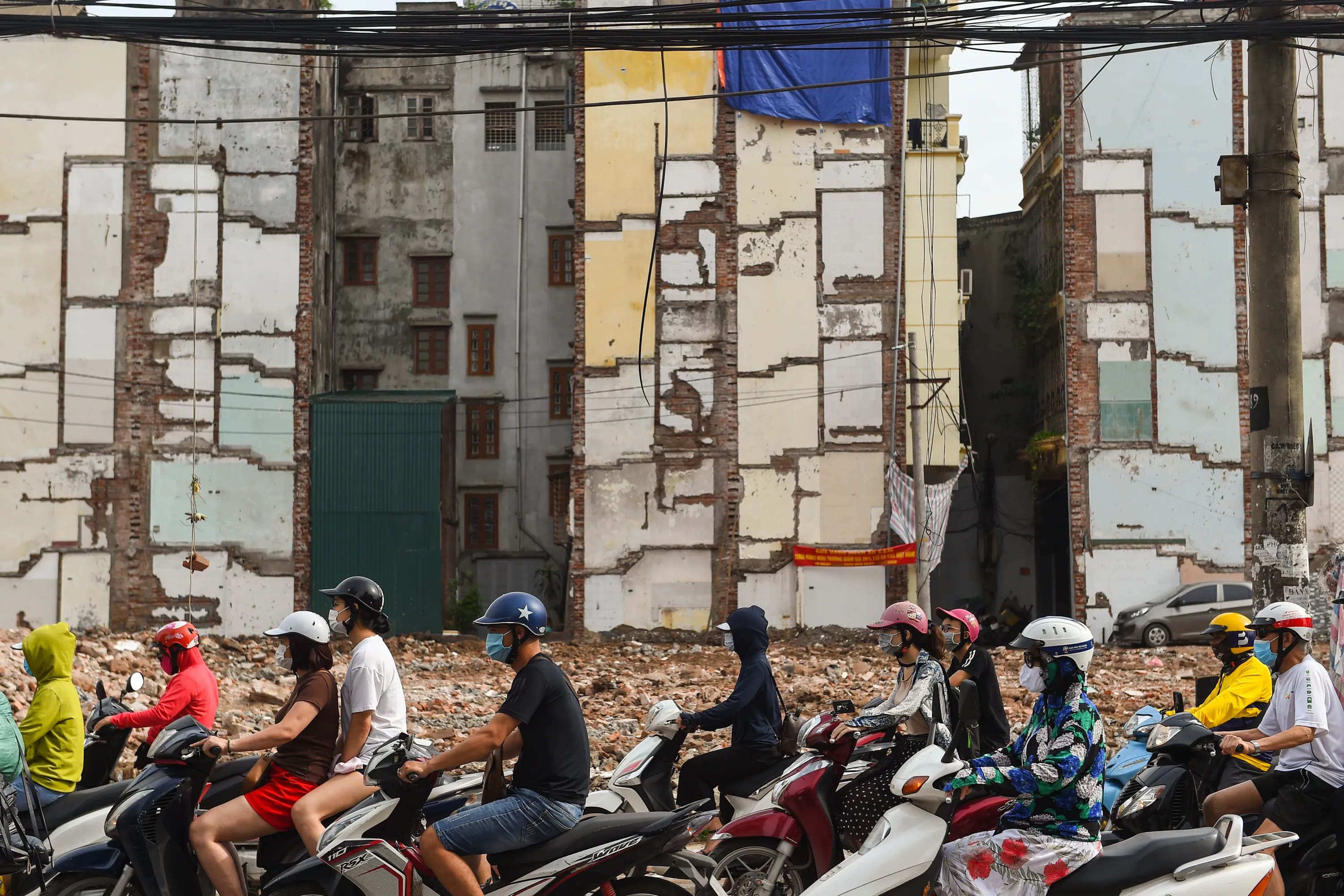 Motorists ride their vehicles past a residential area being cleared for road expansion in Hanoi on August 25, 2020. (Photo by Nhac Nguyen/AFP Photo)