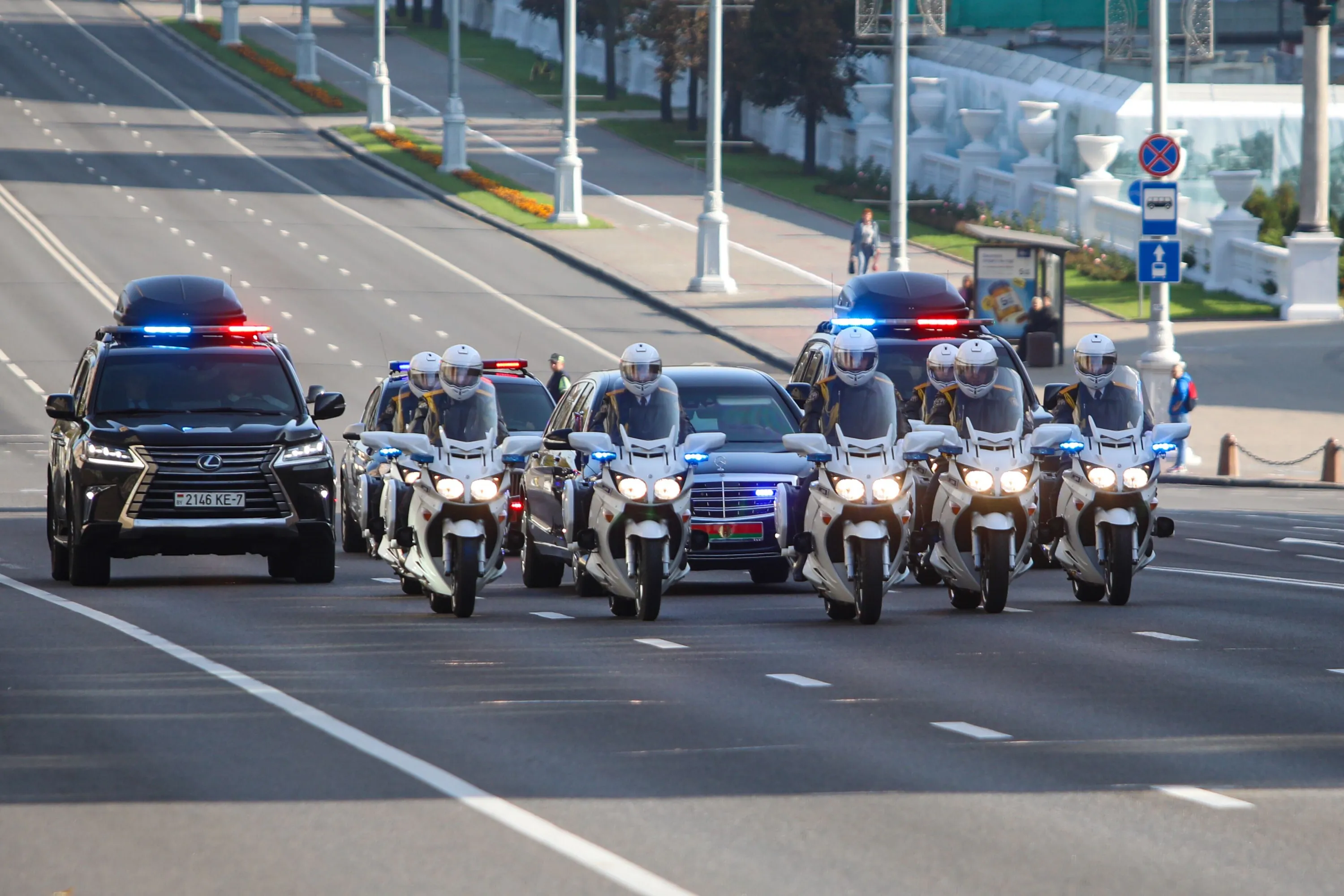 Belarussian President Alexander Lukashenko's motorcade moves along the empty Independence Avenue to arrives for the inauguration ceremony at the Palace of Independence in Minsk, Belarus on September 23, 2020. (Photo by Radio Free Europe/Radio Liberty)